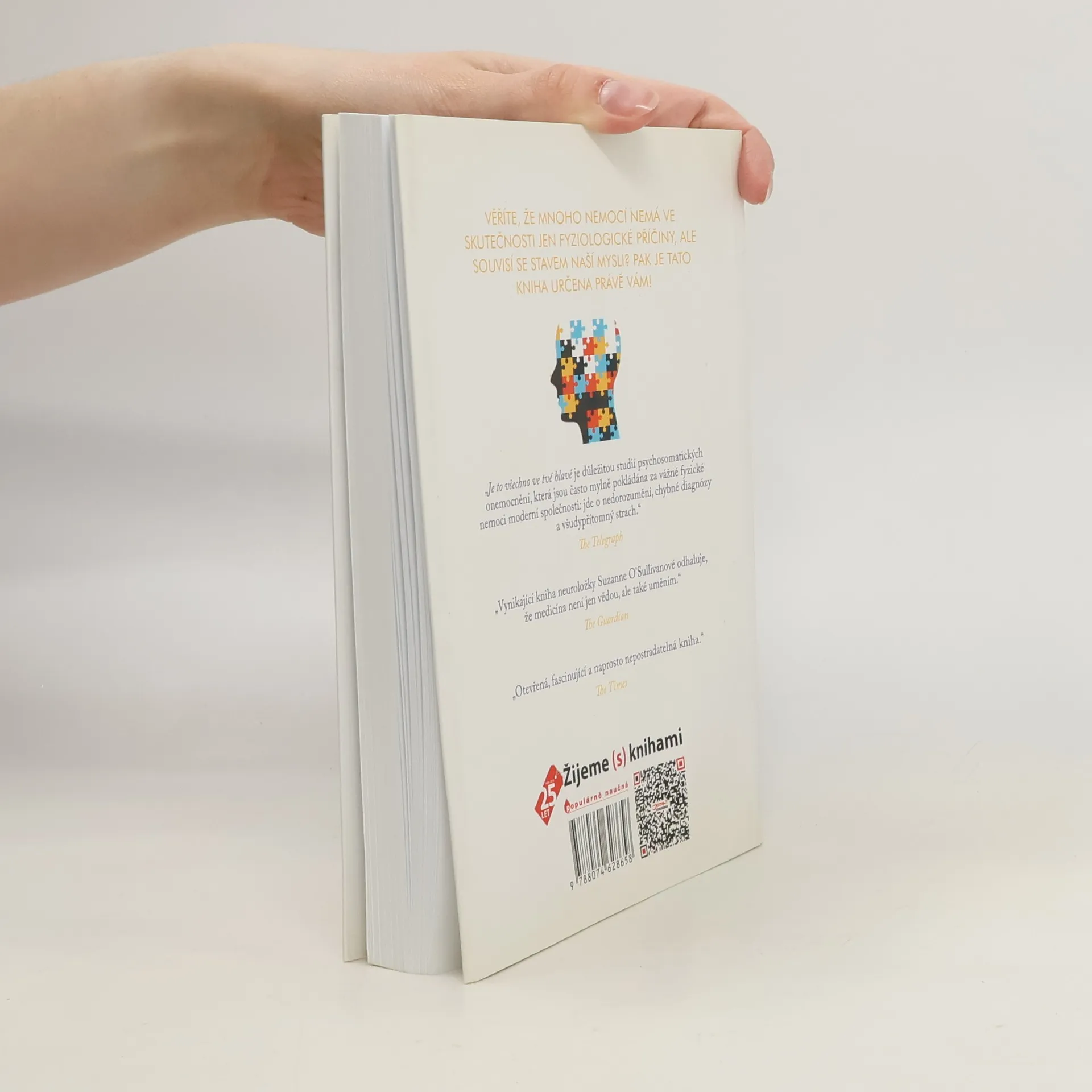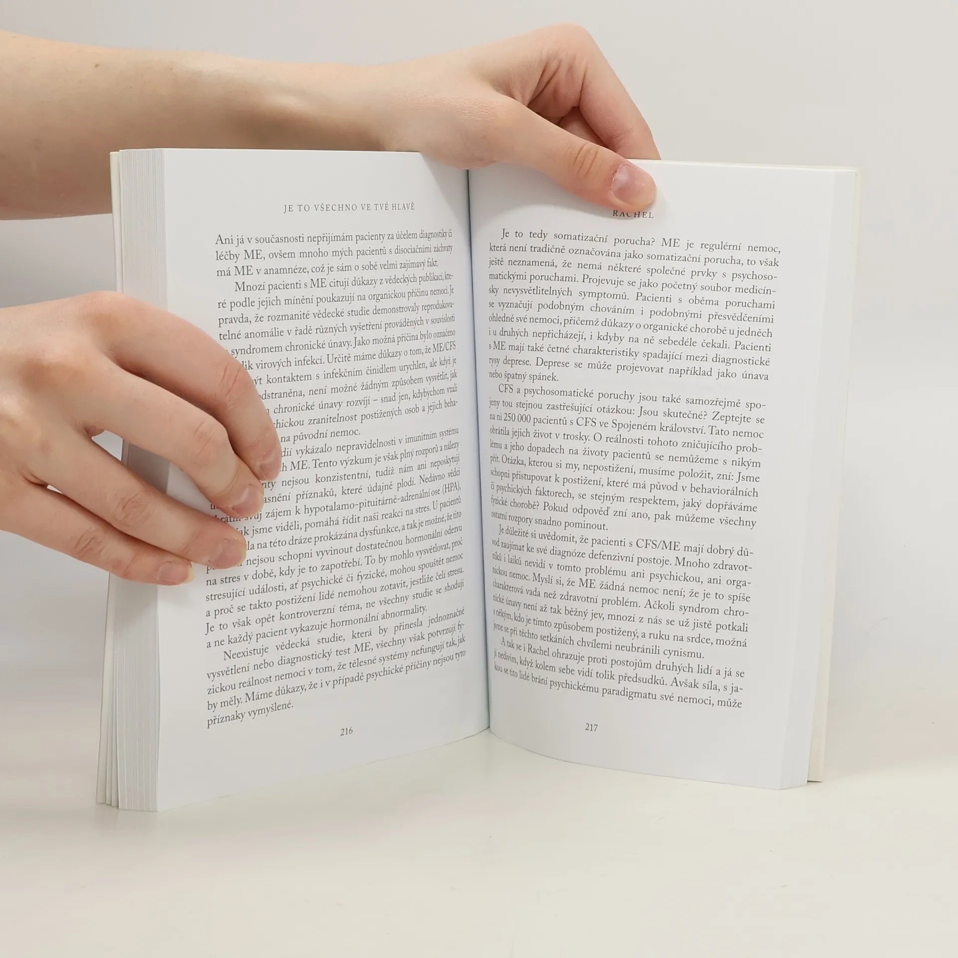 Primářka neurologie dr. Suzanne O’Sullivanová nás ve své knize Je to všechno ve tvé hlavě provede ošidným světem psychosomatických nemocí. Seznámíme se s pacienty jako Pauline, která byla v dospělosti neustále nemocná, nebo s právničkou Camillou, jejíž život byl po všech stránkách dokonalý – až na nevysvětlitelné záchvaty, s Yvonne, kterou v práci oslepil čisticí sprej, nebo se slibnou tanečnicí Rachel, která náhle uvízla v očistci myalgické encefalomyelitidy. Suzanne O’Sullivanová nás vybízí, abychom se na své potíže podívali podrobněji, snažili se přijít na kloub tajemstvím, která umíme dokonale skrývat sami před sebou, a abychom se pokusili pochopit, odkud pramení naše odvěká neochota vzít na vědomí velmi úzký a pozoruhodný vztah mezi naší myslí a fyzickým tělem.