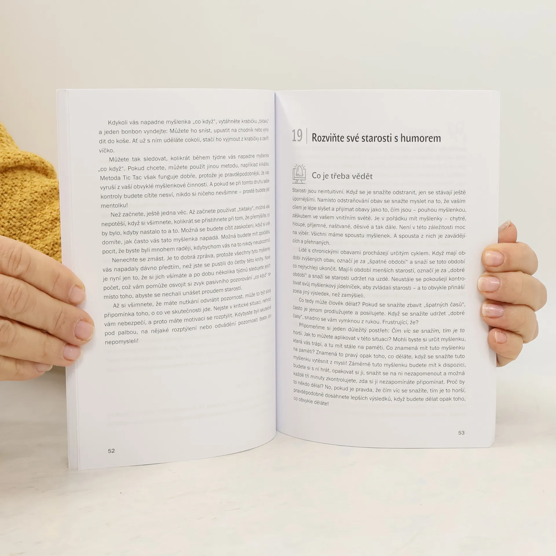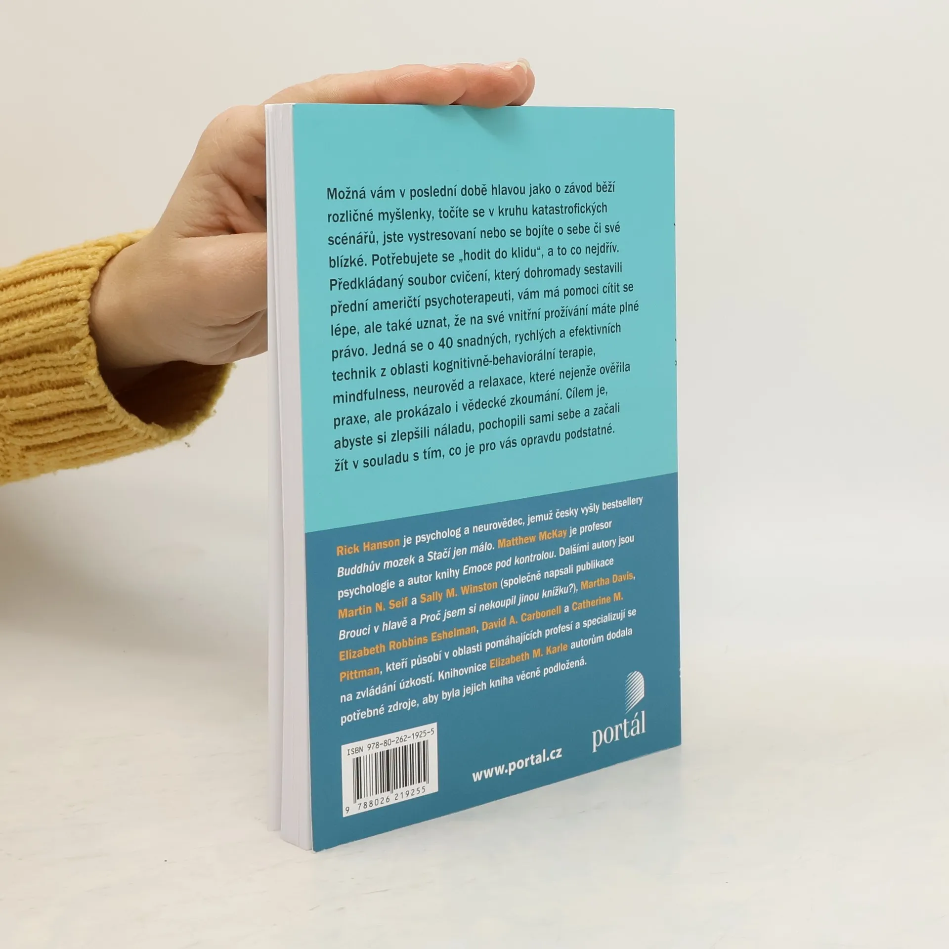 Žijeme v nejisté době. Možná vám v poslední době hlavou jako o závod běží rozličné myšlenky, točíte se v kruhu katastrofických scénářů, jste vystresovaní nebo se bojíte se o sebe či své blízké. Potřebujete se „hodit do klidu“, a to co nejdřív. Předkládaný soubor cvičení, který dohromady sestavili přední američtí profesionálové v oblasti pomáhajících profesí, vám má pomoci cítit se lépe, ale také uznat, že na své vnitřní prožívání máte plné právo. Jedná se o 40 snadných, rychlých a efektivních technik z oblasti kognitivně-behaviorální terapie, mindfulness, neurověd a relaxace, které nejenže ověřila praxe, ale prokázalo i vědecké zkoumání. Cílem je, abyste si zlepšili náladu, pochopili sami sebe a začali žít v souladu s tím, co je pro vás opravdu podstatné. Rick Hanson je psycholog a neurovědec, jemuž česky vyšly bestsellery Buddhův mozek a Stačí jen málo. Matthew McKay je profesor psychologie a autor publikace, která byla v češtině vydána pod názvem Emoce pod kontrolou. Dalšími autory jsou Martin N. Seif a Sally M. Winston (společně napsali knihu Brouci v hlavě), Martha Davis, Elizabeth Robbins Eshelman, David A. Carbonell, Catherine M. Pittman a Elizabeth M. Karle, kteří všichni působí v oblasti pomáhajících profesí a specializují se na zvládání úzkostí.