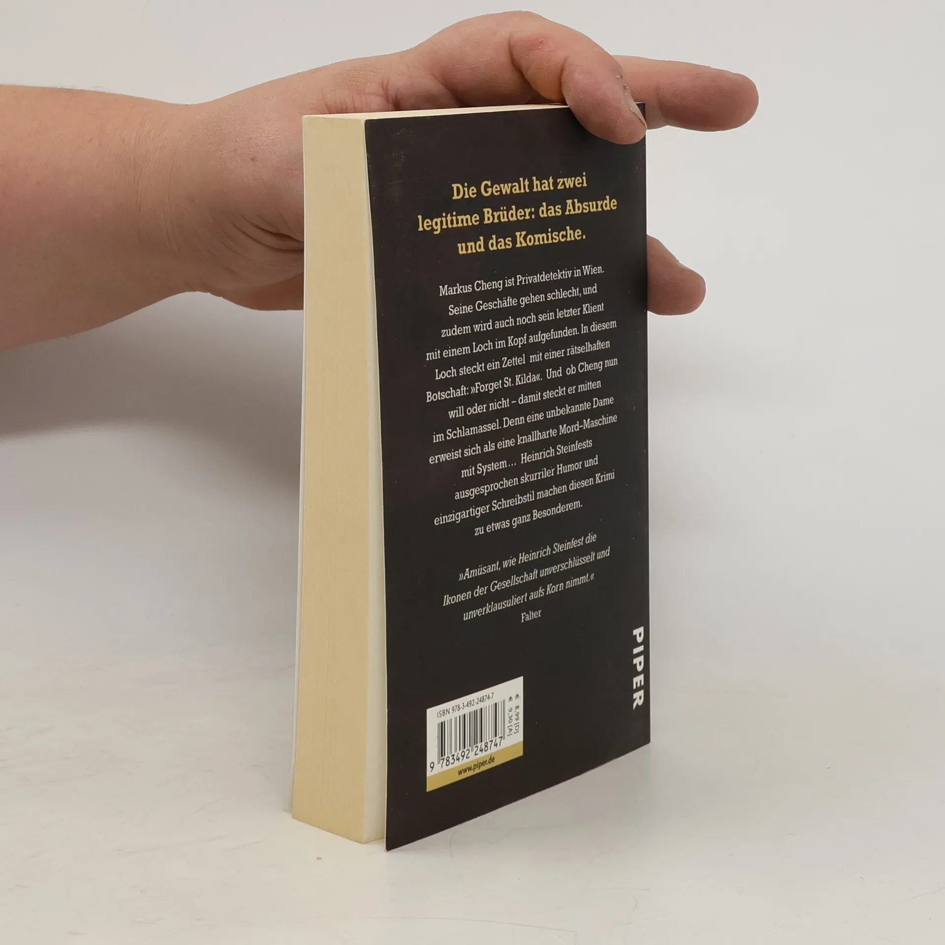 Markus Cheng ist Privatdetektiv in Wien. Seine Geschäfte gehen schlecht, und zudem wird auch noch sein letzter Klient mit einem Loch im Kopf aufgefunden. In diesem Loch steckt ein Zettel mit einer rätselhaften Botschaft: »Forget St. Kilda«. Und ob Cheng nun will oder nicht – damit steckt er mitten im Schlamassel. Denn eine unbekannte Dame erweist sich als eine knallharte Mordmaschine mit System … Heinrich Steinfests ausgesprochen skurriler Humor und einzigartiger Schreibstil machen diesen Krimi zu etwas ganz Besonderem.