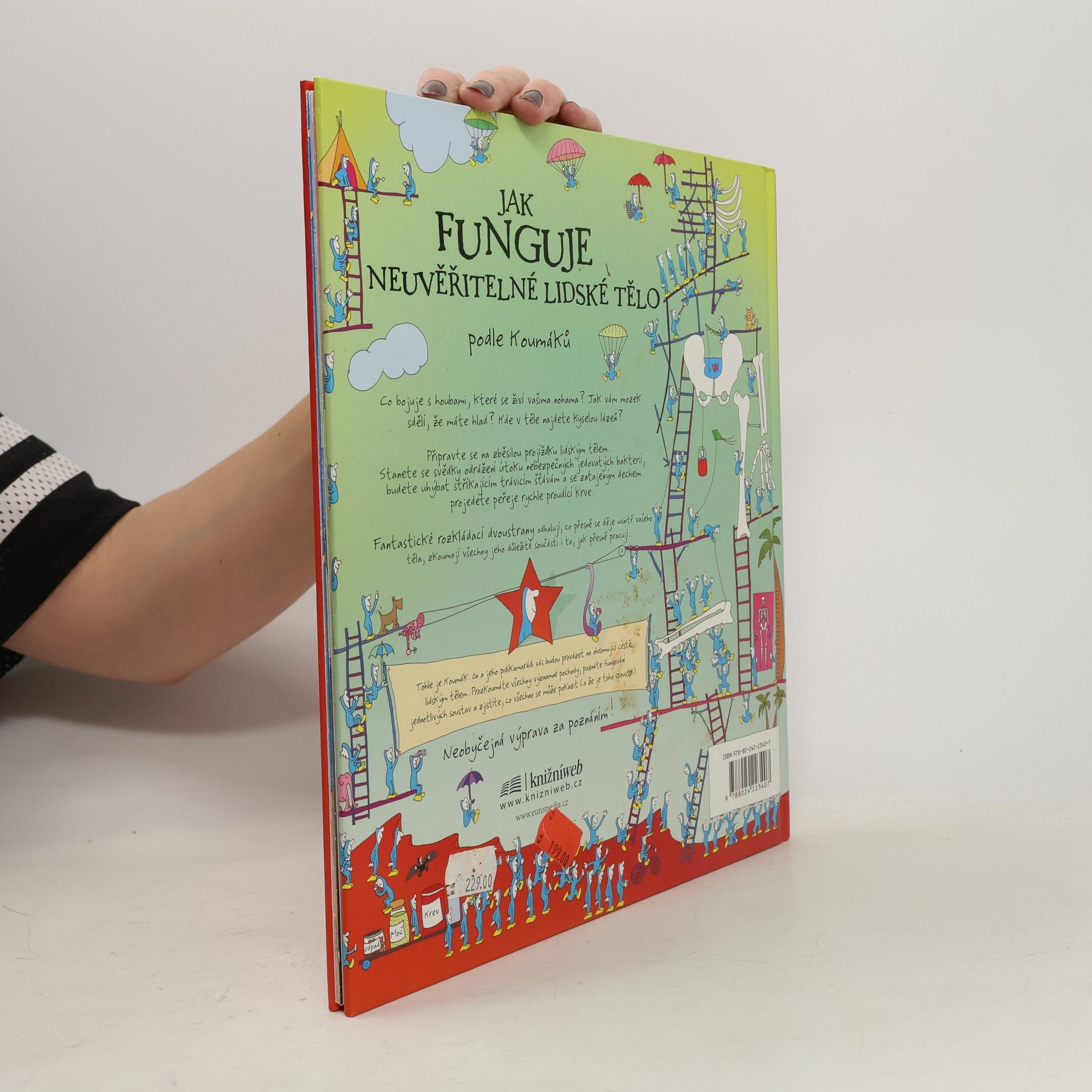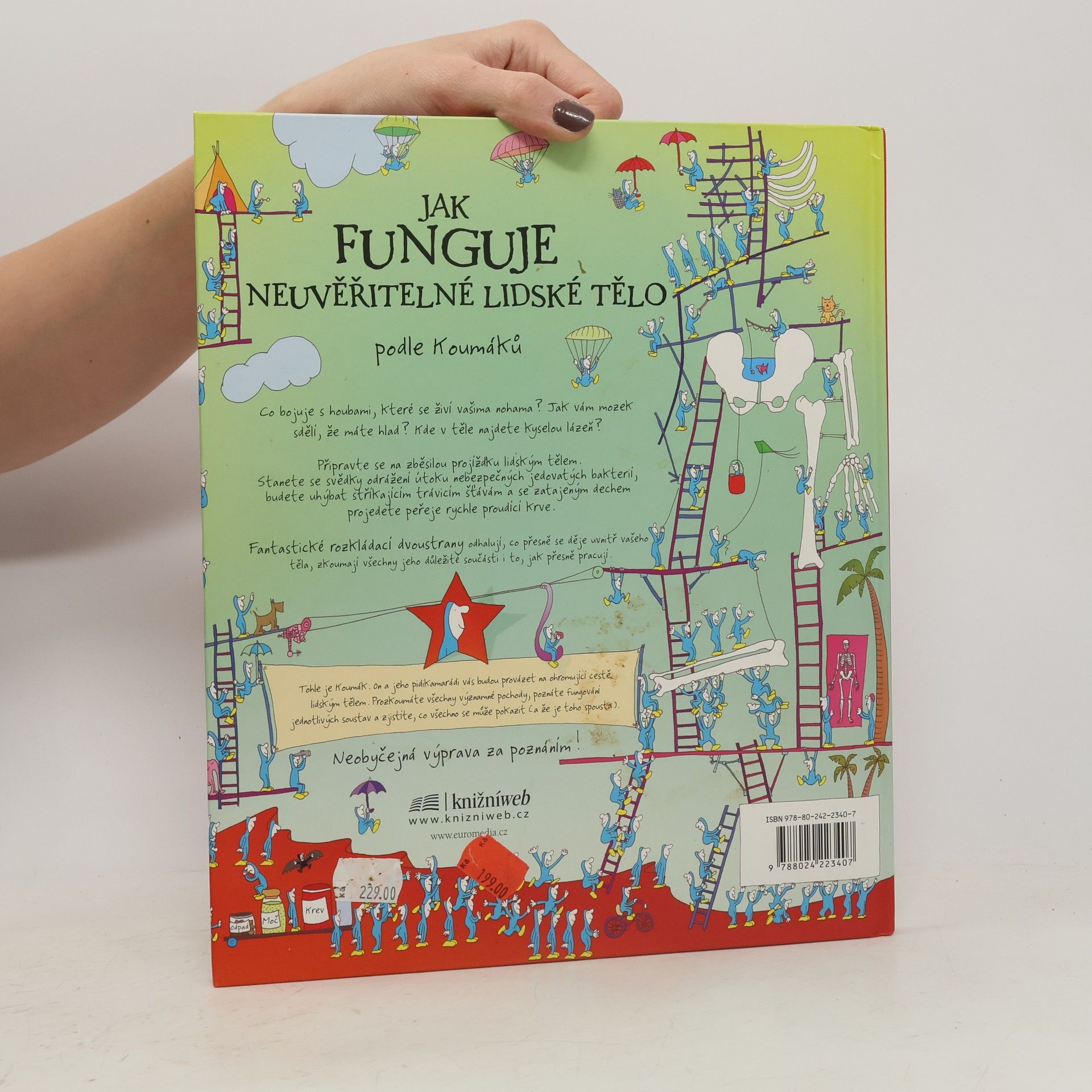 Podnikavé, energické a všetečné postavičky jménem Koumáci vás provedou fungováním lidského těla tak, jak jste je ještě nepoznali. Vydáte se pod kůži, abyste nakoukli do toho úžasného, neuvěřitelného a taky trochu nechutného stroje nazývaného lidské tělo. Prohlédnete si všechny tělesné soustavy, které vás udržují při životě: trávení, dýchání, nervy, smysly, svaly, kosti a mnohem víc. V knize je i řada rozkládacích stran, přičemž každá taková skládanka je zaměřená na určitou hlavní část těla a významný tělesný pochod: například jak pružná sada svalů uvádí do pohybu kostru nebo jaké neskutečné množství vzkazů vysílá a přijímá mozek každou nanosekundu. Koumáci vás zvou k báječnému anatomickému dobrodružství.