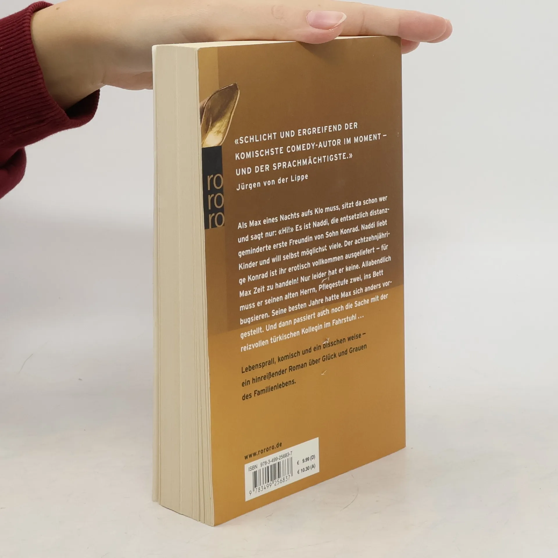 Als Max eines Nachts aufs Klo muss, sitzt da schon wer und sagt nur: «Hi!» Es ist Naddi, die entsetzlich distanzgeminderte erste Freundin von Sohn Konrad. Naddi liebt Kinder und will selbst möglichst viele. Der achtzehnjährige Konrad ist ihr erotisch vollkommen ausgeliefert – für Max Zeit zu handeln! Nur leider hat er keine. Allabendlich muss er seinen alten Herrn, Pflegestufe zwei, ins Bett bugsieren. Seine besten Jahre hatte Max sich anders vorgestellt. Und dann passiert auch noch die Sache mit der reizvollen türkischen Kollegin im Fahrstuhl… Lebensprall, komisch, und ein bisschen weise – ein hinreißender Roman über Glück und Grauen des Familienlebens.