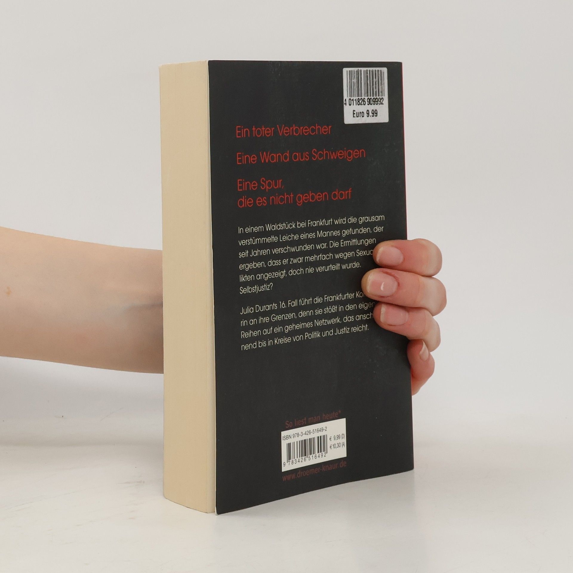 In einem Waldstück bei Frankfurt wird die Leiche eines Sexualstraftäters gefunden, der seit Jahren als vermisst galt. Die Ermittlungen ergeben, dass der Mann zwar mehrfach verdächtigt, doch nie verurteilt wurde. In den Akten tauchen immer wieder derselbe Richter und dieselben Anwälte auf – Zufall? Die brutalen Verletzungen des Mordopfers lassen auf ein sehr persönliches Motiv schließen. Und auf große Wut. Und während Julia Durant sich noch mit der Frage herumschlägt, wem sie hier eigentlich zu Gerechtigkeit verhilft, muss sie erkennen, dass ihr der Gegenwind auch aus den eigenen Reihen entgegenschlägt.