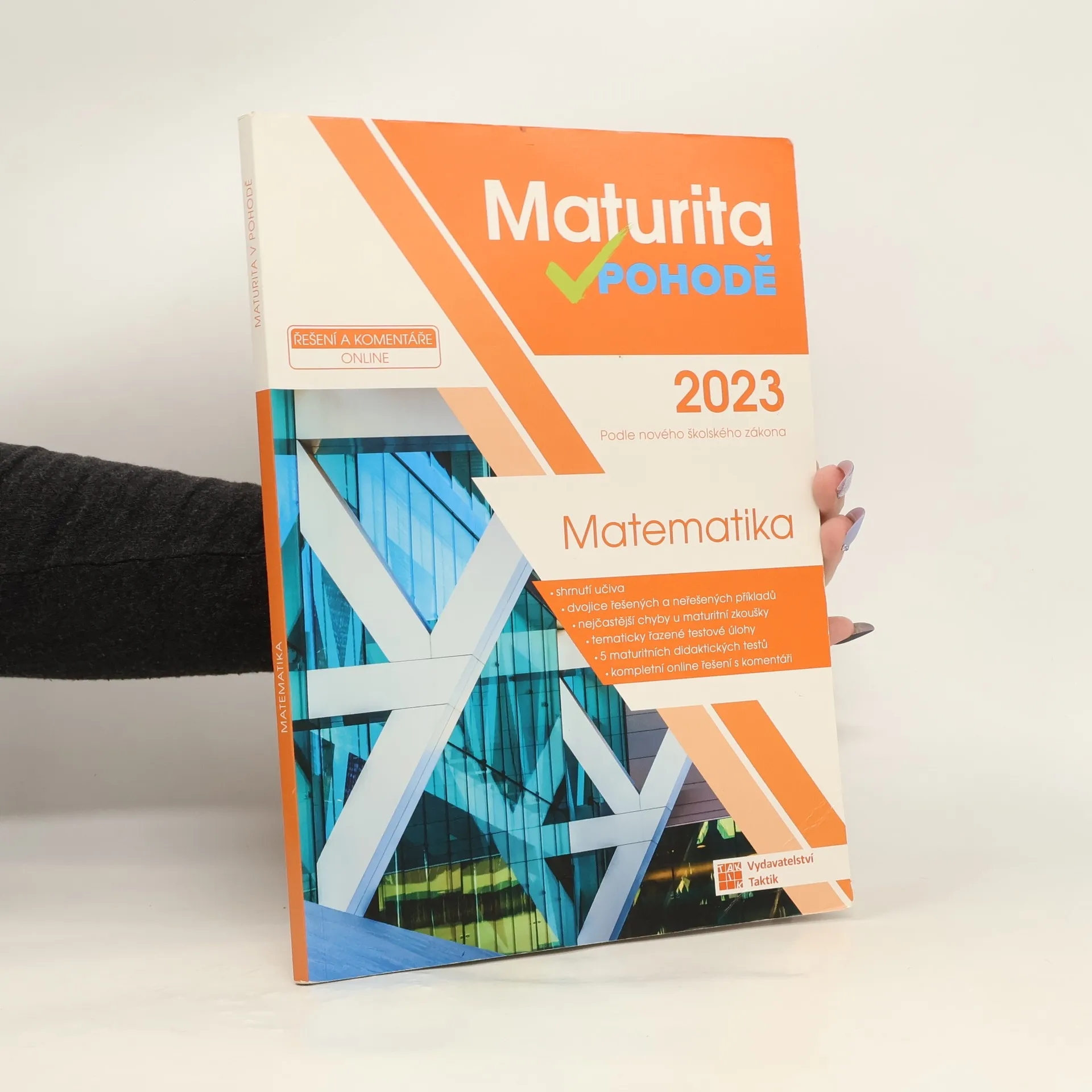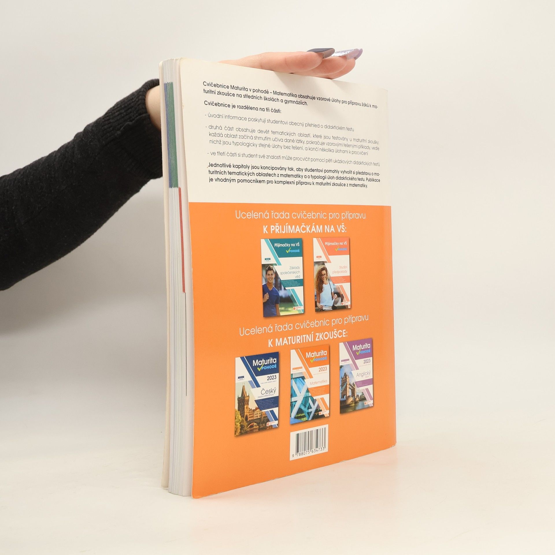 Cvičebnice Maturita v pohodě – matematika obsahuje materiály pro komplexní přípravu na Jednotou přijímací zkoušku (JPZ) na střední školy se studiem ukončeným maturitní zkouškou. Příručka obsahuje 9 testovacích okruhů. Každý okruh se skládá ze shrnutí učiva, aby si žák mohl zopakovat potřebnou látku, dvojic řešených a neřešených úloh, kde si žák může prohlédnout vyřešené a podle nich vypočítat ty neřešené, a tím se seznámit s typologií úloh v didaktickém testu. Následují vypracované úlohy, ve kterých se v minulých letech nejvíce chybovalo s radami, jak se chybám vyhnout. Okruh uzavírají úlohy k procvičení. Nakonec si své znalosti muže žák procvičit pomocí 5 ukázkových didaktických testu i s odpovědními archy. K cvičebnici je navíc e-learning s videi vysvětlujícími učivo a dalšími úlohami. Přístup získáte po zaregistrování a zadání přístupového kódu na studium.vpohode.cz, kde najdete vypracovaná řešení a odpovědní archy k úlohám z příručky.
