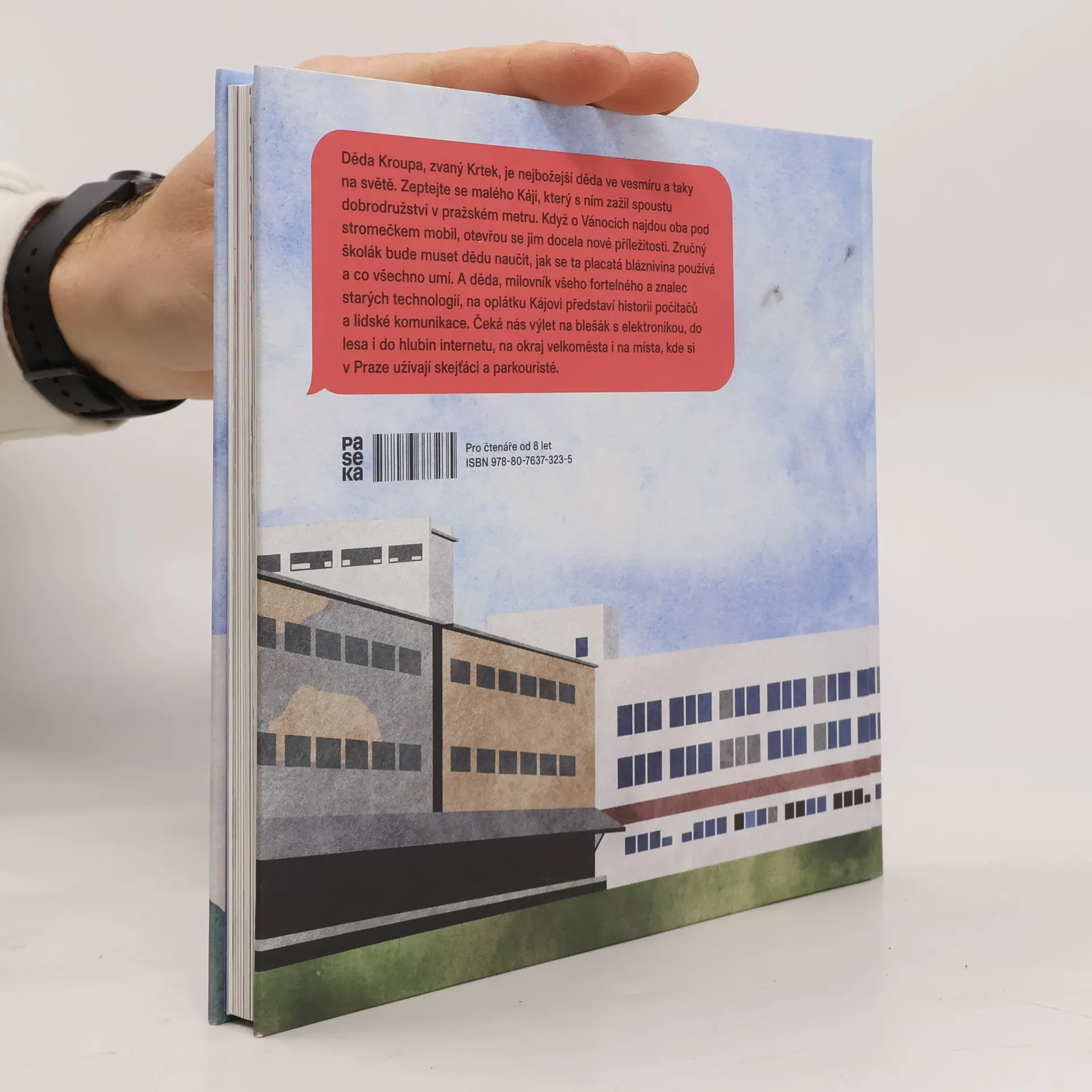 Děda Kroupa, zvaný Krtek, je nejbožejší děda ve vesmíru a taky na světě. Zeptejte se malého Káji, který s ním zažil spoustu dobrodružství v pražském metru. Když o Vánocích najdou oba pod stromečkem mobil, otevřou se jim docela nové příležitosti. Zručný školák bude muset dědu naučit, jak se ta placatá bláznivina používá a co všechno umí. A děda, milovník všeho fortelného a znalec starých technologií, na oplátku Kájovi představí historii počítačů a lidské komunikace. Čeká nás výlet na blešák s elektronikou, do lesa i do hlubin internetu, na okraj velkoměsta i na místa, kde se v Praze scházejí skejťáci a parkouristé. Tohle je knížka, která dětem vysvětlí, jak funguje náš moderní svět. A ukáže jim, proč stojí za to zvednout oči od displejů a vyrazit ven. Klidně i s mobilem v kapse. Protože jak říká děda, pokrok nezastavíš, čéče!