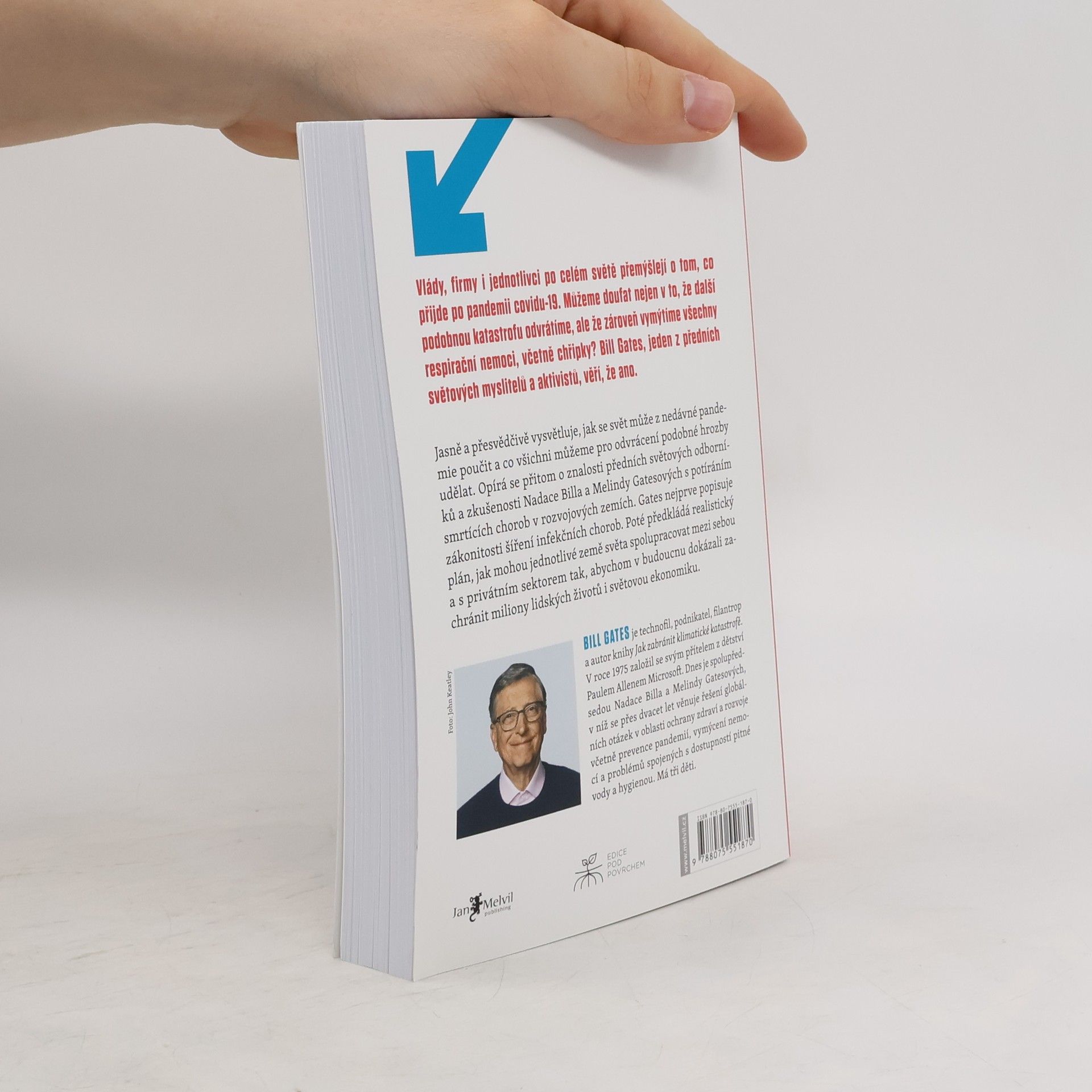 „Se zápalem, ale bez moralizování přináší Gates celému světu promyšlený apel ke sjednocení proti budoucím pandemiím.“ — Booklist Po pandemii covidu-19 se vlády, firmy a jednotlivci zamýšlejí nad tím, co nás čeká. Bill Gates, významný myslitel a aktivista, věří, že můžeme nejen odvrátit další katastrofu, ale také vymýtit respirační nemoci včetně chřipky. Vysvětluje, jak se poučit z nedávné krize a co můžeme udělat pro prevenci. Opírá se o znalosti odborníků a zkušenosti své nadace v boji proti smrtícím chorobám v rozvojových zemích. Gates popisuje šíření infekčních chorob a předkládá realistický plán mezinárodní spolupráce se soukromým sektorem, aby se zachránily miliony životů a podpořila světová ekonomika. Vize blízké budoucnosti zahrnuje snadno aplikovatelné vakcíny, využití umělé inteligence pro rychlejší vývoj léků a prevenci lokálních epidemíí. Zmiňuje také krizové scénáře spojené s uvolněním metanu a klimatické změny. Bill Gates, zakladatel Microsoftu a spolupředseda své nadace, se více než dvacet let věnuje globálním otázkám v oblasti zdraví a rozvoje. Má tři děti.