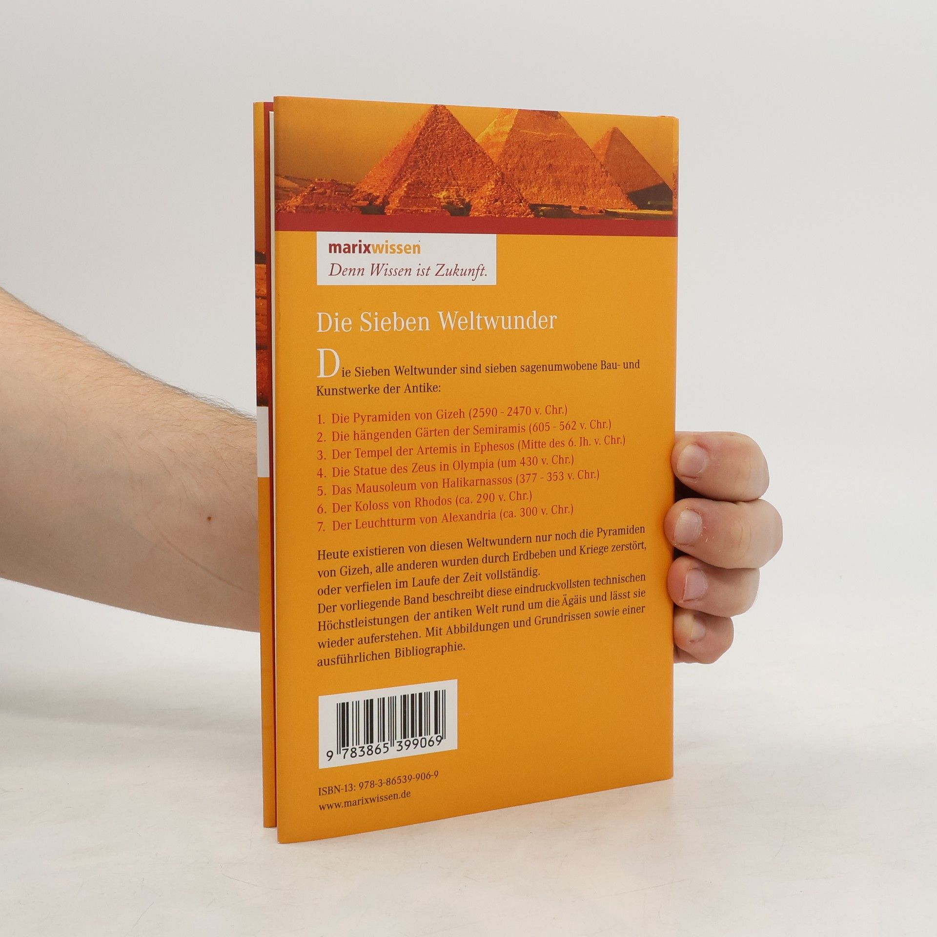 Die Sieben Weltwunder sind sieben sagenumwobene Bau- und Kunstwerke der Antike. Das älteste bekannte Zeugnis darüber legte der griechische Dichter Antipatros von Sidon (2. Jhd. V. Chr.) ab. Seitdem zählt man dazu: 1. Die Pyramiden von Gizeh (2590 – 2470 v. Chr.) 2. Die hängenden Gärten der Semiramis (605 – 562 v. Chr.) 3. Der Tempel der Artemis in Ephesos (Mitte des 6. Jahrhunderts v. Chr.) 4. Die Goldelfenbein-Statue des Zeus in Olympia (um 430 v. Chr.) 5. Das Mausoleum von Halikarnassos (377 – 353 v. Chr.) 6. Der Koloss von Rhodos (ca. 290 v. Chr.) 7. Der Leuchtturm von Alexandria (ca. 300 v. Chr.) Heute existieren von diesen Weltwundern nur noch die Pyramiden von Gizeh – alle anderen wurden durch Erdbeben und Kriege zerstört, oder zerfielen im Laufe der Zeit vollständig. Die ursprünglich aufgelisteten Stadtmauern von Babylon wurden z. B. durch Gregor von Tours im 6. Jahrhundert aus der Liste entfernt, da sie zerstört waren, und durch den Leuchtturm von Alexandria ersetzt worden waren. Der vorliegende Band beschreibt diese eindrucksvollen technischen Höchstleistungen des damaligen Weltkunstbereiches rings um die Ägäis und lässt sie wieder auferstehen. Mit Abbildungen und Grundrissen, einem Register und Literaturhinweisen.