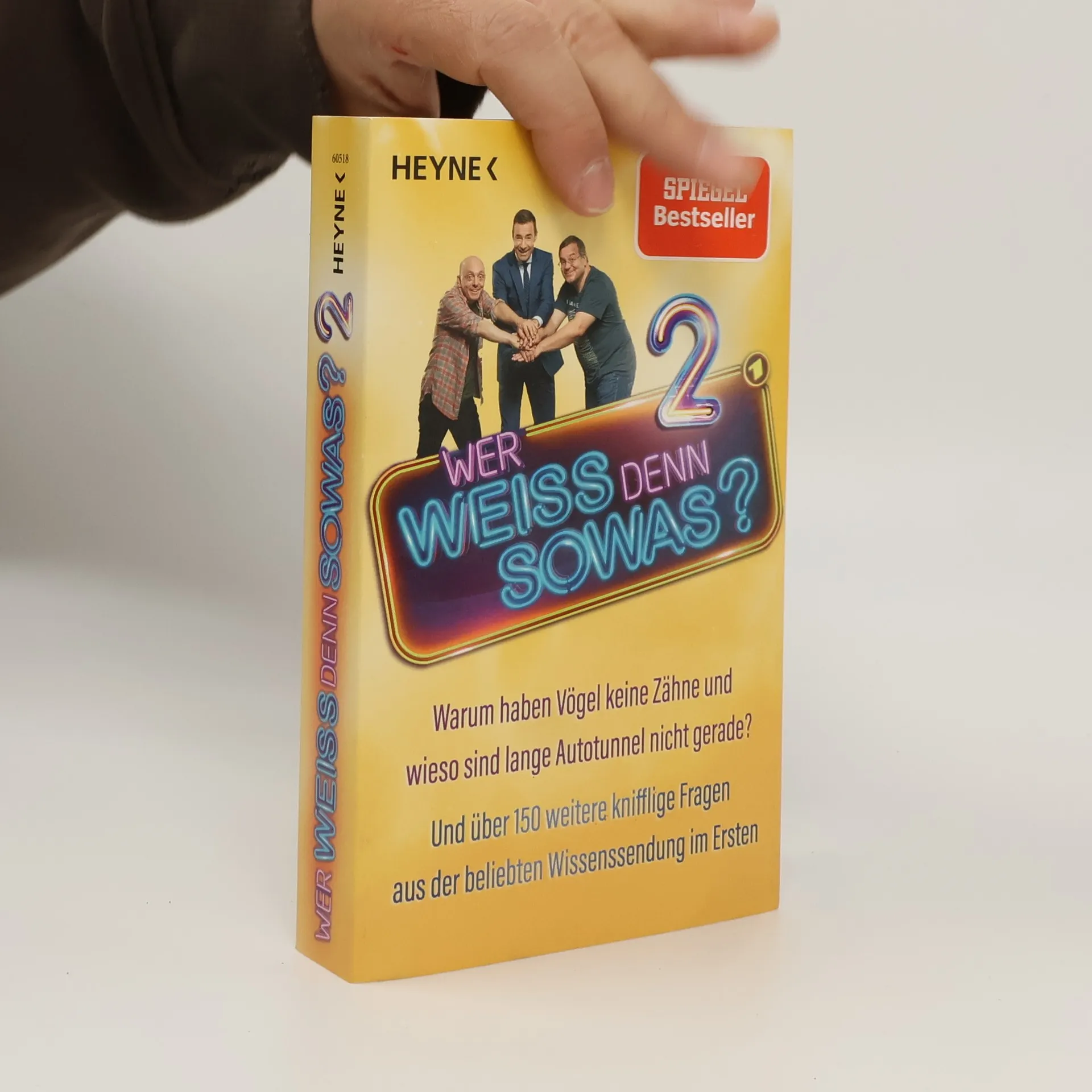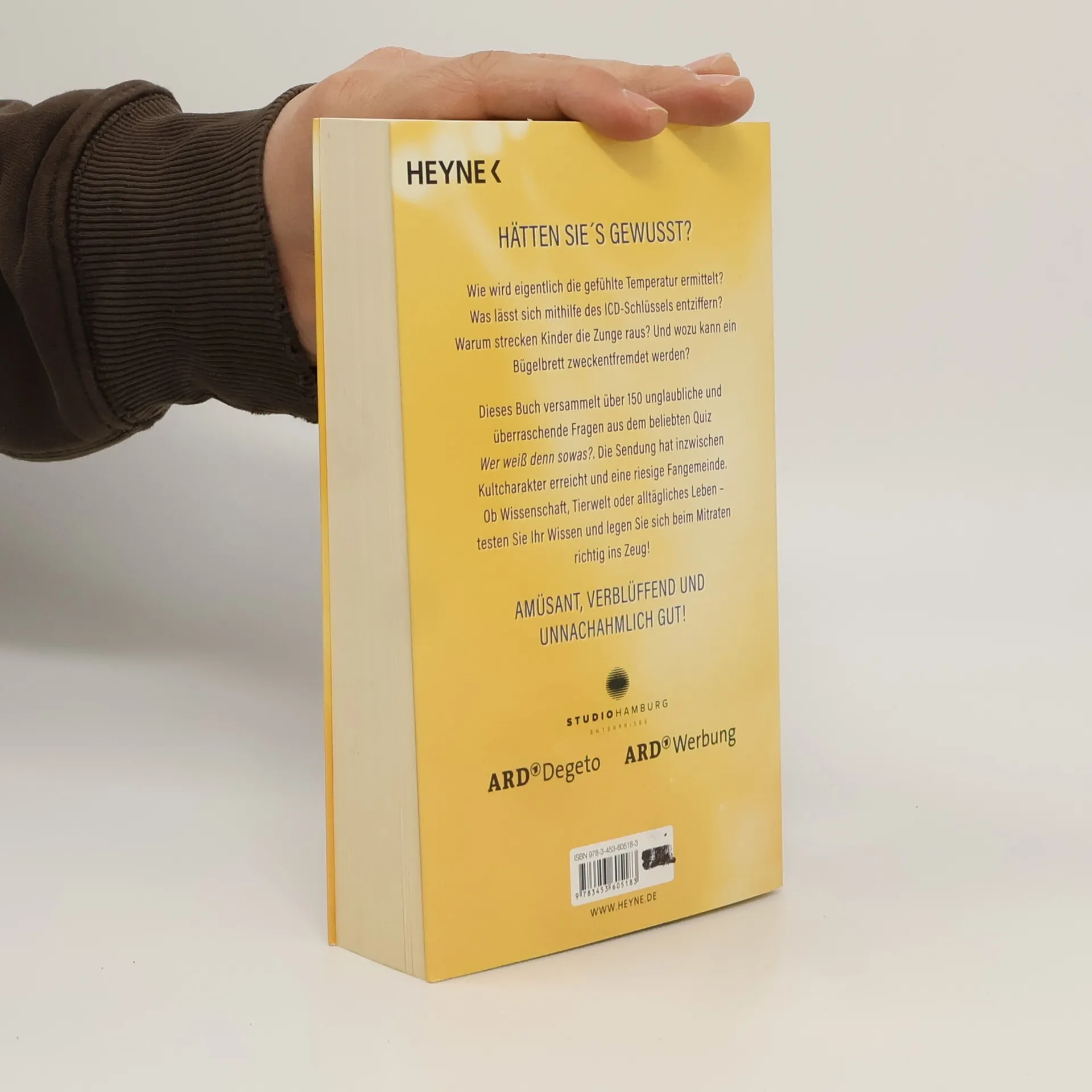 Der Megabestseller geht in die zweite Runde Wie wird eigentlich die gefühlte Temperatur ermittelt? Was lässt sich mithilfe des ICD-Schlüssels entziffern? Warum strecken Kinder die Zunge raus? Und wozu kann ein Bügelbrett zweckentfremdet werden? Dieses Buch versammelt über 150 neue unglaubliche und überraschende Fragen aus dem beliebten Quiz »Wer weiß denn sowas?«. Die Sendung hat inzwischen Kultcharakter erreicht und eine riesige Fangemeinde. Deshalb kommt nach dem Megaerfolg des ersten Bandes nun die Fortsetzung: Ob Wissenschaft, Tierwelt oder alltägliches Leben – testen Sie Ihr Wissen und legen Sie sich beim Mitraten richtig ins Zeug! Das Beste aus der beliebten Quizsendung – amüsant, verblüffend und unnachahmlich gut!