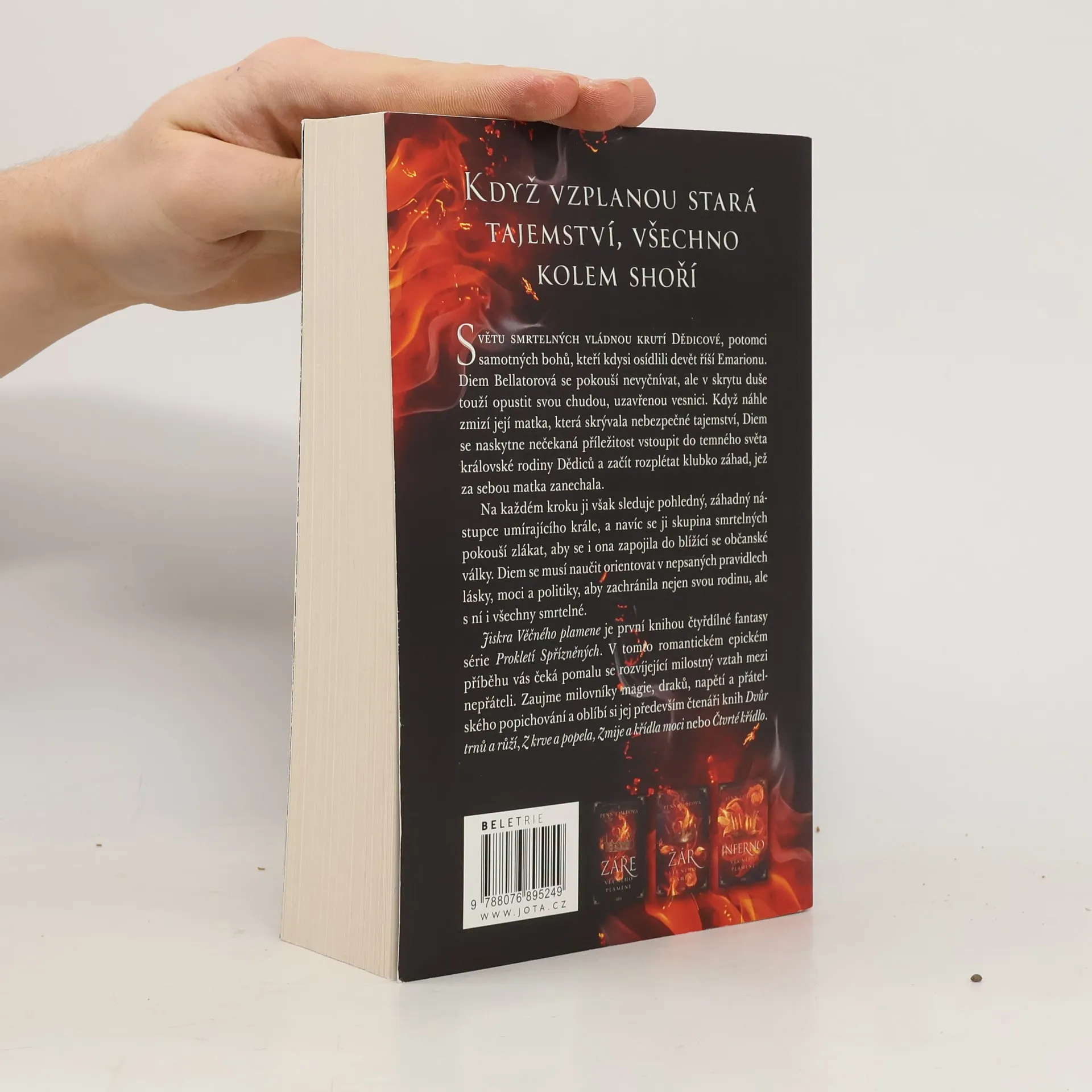 Když vzplanou stará tajemství, všechno kolem shoří. Světu smrtelných vládnou krutí Dědicové, potomci samotných bohů, kteří kdysi osídlili devět říší Emarionu. Diem Bellatorová se pokouší nevyčnívat, ale v skrytu duše touží opustit svou chudou, uzavřenou vesnici. Když náhle zmizí její matka, která skrývala nebezpečné tajemství, Diem se naskytne nečekaná příležitost vstoupit do temného světa královské rodiny Dědiců a začít rozplétat klubko záhad, jež za sebou matka zanechala. Na každém kroku ji sleduje pohledný, záhadný nástupce umírajícího krále. K tomu je tu skupina smrtelných, která se ji pokouší zlákat, aby se i ona zapojila do blížící se občanské války. Diem se musí naučit orientovat v nepsaných pravidlech lásky, moci a politiky, aby zachránila nejen svou rodinu, ale s ní i všechny smrtelné. Jiskra Věčného plamene je první knihou čtyřdílné fantasy série Prokletí Spřízněných. V tomto romantickém epickém příběhu vás čeká pomalu se rozvíjející vztah mezi nepřáteli. Zaujme milovníky magie, draků, napětí a přátelského popichování a oblíbí si jej především čtenáři knih Dvůr trnů a růží, Z krve a popela, Zmije a křídla noci nebo Čtvrté křídlo.