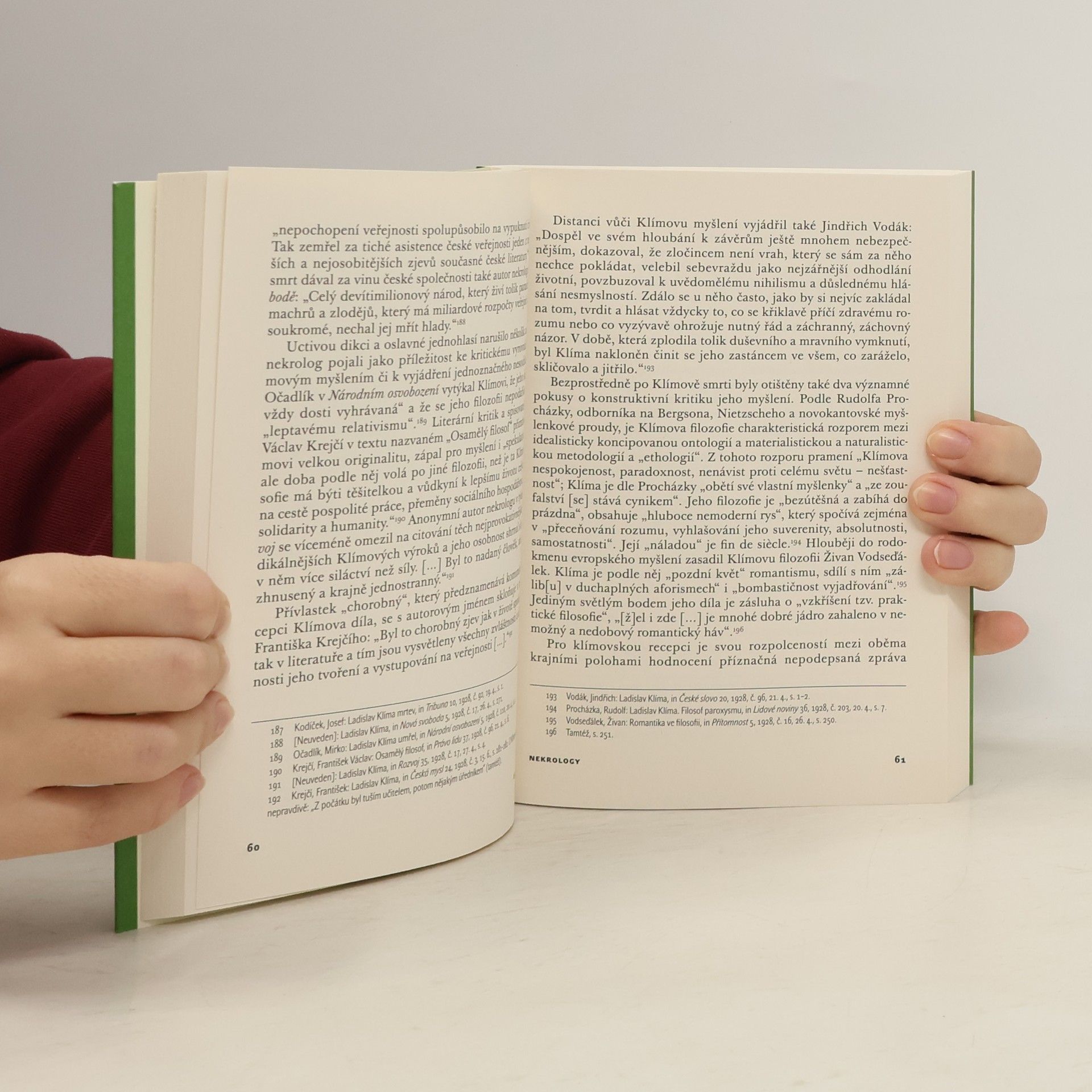 Dílo Ladislava Klímy má v dějinách české literatury a filozofie zvláštní význam, a to už jen tím, že spadá stejnou měrou do obou oblastí. Tvůrců, kteří se intenzivně věnovali jak filozofické, tak beletristické činnosti a u nichž jsou obě spojeny v jedinou konzistentní výpověď, nemá česká kultura mnoho. Ovšem i v rámci jednotlivých oborů působilo Klímovo dílo v době svého vzniku cizorodě. Radikálními myšlenkovými postoji i metafyzickou spekulací se Klíma vymykal povaze soudobé české filozofie, jež bývá většinou zjednodušeně charakterizována pozitivistickou střízlivostí, orientací psychologickou a sociologickou a odtažitým vztahem k metafyzice. Pro experimentální charakter jeho imaginativních textů jej někteří kritici a interpreti označovali za předchůdce celé řady moderních uměleckých směrů, jiní se o něm vyjadřovali jako o „chorobném zjevu“. Kniha sleduje, jakými způsoby se česká kultura vypořádávala s jedním ze svých nejradikálnějších kritiků, po jakých cestách do ní jeho dílo vstupovalo a za jakých okolností z ní bylo vylučováno. Recepce Klímova díla může být inspirací pro nové promýšlení jeho odkazu, zároveň na ni lze pohlížet jako na specifický dokument o charakteru českých intelektuálních dějin dvacátého století.
