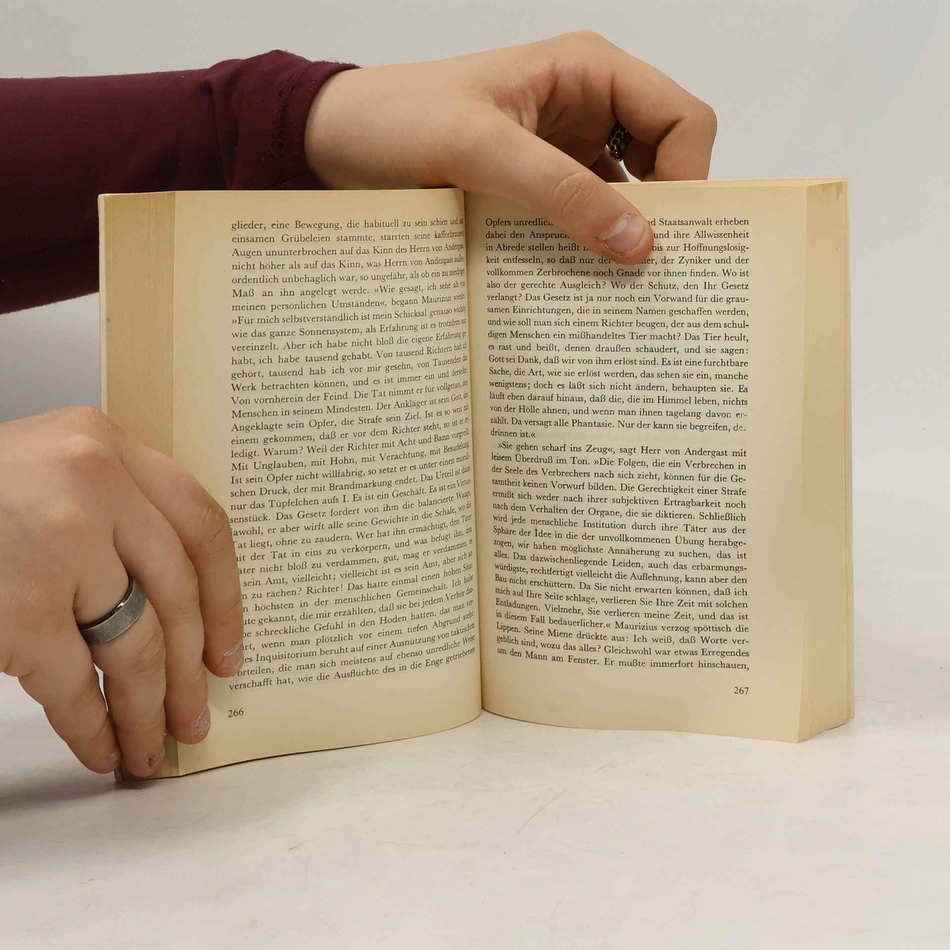 „[.] Laß ab von der Vorstellung, dass Gerechtigkeit und Justiz ein und dasselbe sind oder zu sein haben. Sie können es nicht sein. Es liegt außerhalb menschlicher und irdischer Möglichkeit. Sie verhalten sich zueinander wie die Symbole des Glaubens zur religiösen Übung. Du kannst mit dem Symbol nicht leben. Doch in der strengen und gewissenhaften Übung das ewige Symbol über sich zu wissen, das. wie soll ich sagen, das absolviert. [.]“ – Etzel blickt eine Weile mit zusammengepreßten Lippen vor sich nieder; auf einmal schreit er schrill: „Nein!“ Die Augen funkeln böse. „Nein!“ schreit er abermals. „Damit kann ich und damit will ich nicht leben.“ Sein ganzer Intellekt fängt Feuer. Die Respektschranke bricht zusammen. „Das erkenn ich nicht an“, stammelt er in einer Erbitterung, die sich wie Betrunkenheit äußert, „Symbol. Übung. Was denn. Faule Ausreden.“
