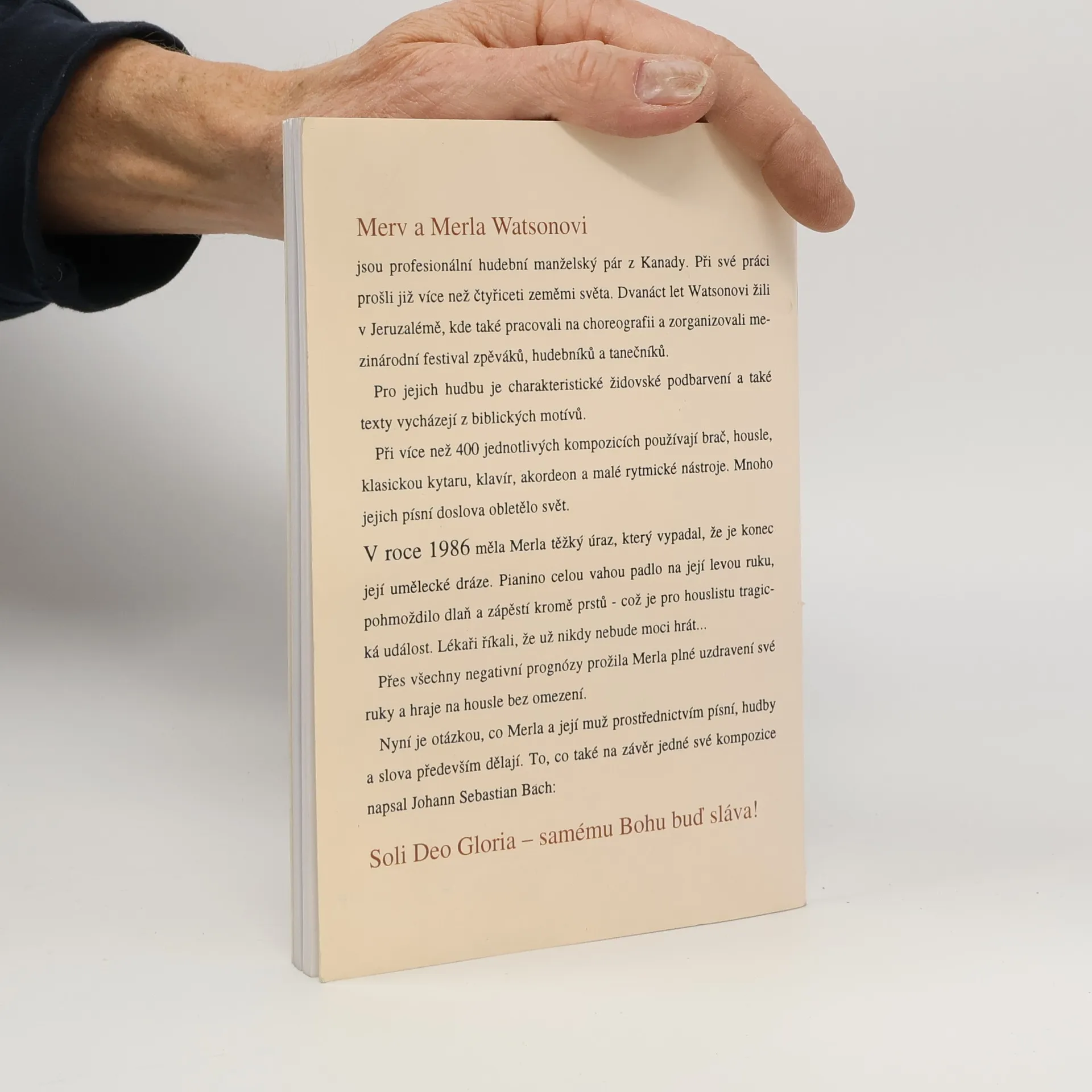 Merv a Merla Watsonovi jsou profesionální hudební manželský pár z Kanady. Dvanáct let Watsonovi žili v Jeruzalémě. Pro jejich hudbu je charakteristické židovské zabarvení a také texty vycházející z biblických motivů. V roce 1986 měla Merla těžký úraz, který vypadal, že je konec její umělecké dráze. Pianino celou vahou dadlo na její levou ruku, pohmoždilo dlaň a zápěstí...Přes všechny negativní prognózy prožila Merla plné uzdravení své ruky a hraje na housle bez omezení.