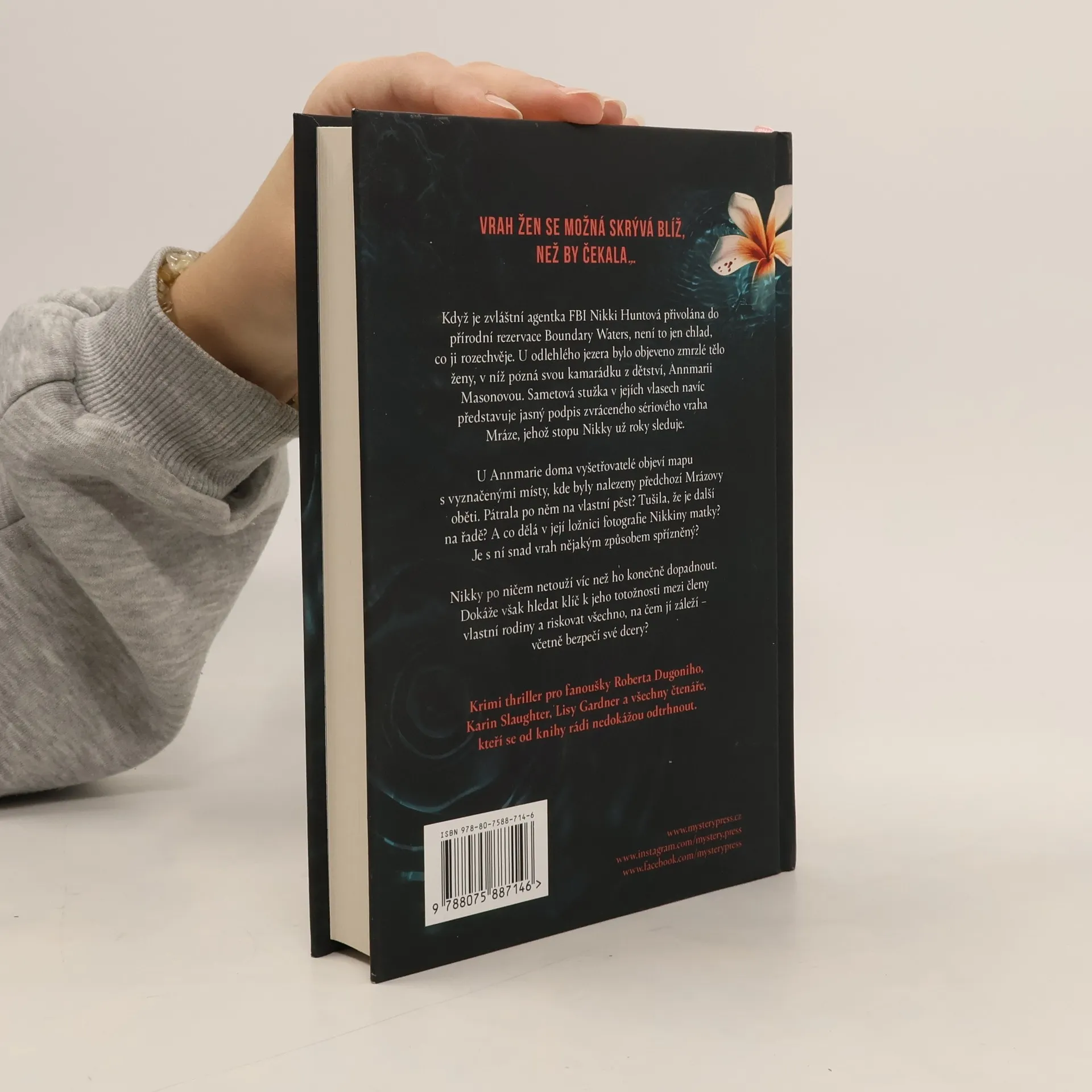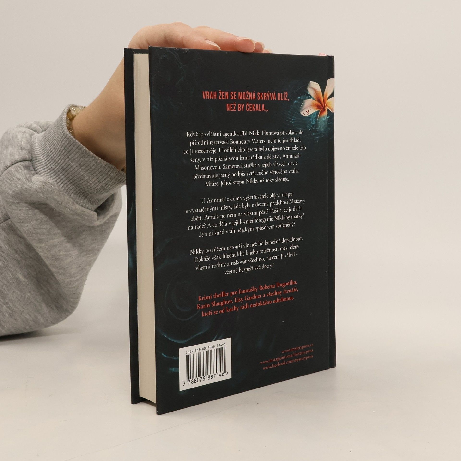 VRAH ŽEN SE MOŽNÁ SKRÝVÁ BLÍŽ, NEŽ BY ČEKALA… Když je zvláštní agentka FBI Nikki Huntová přivolána do přírodní rezervace Boundary Waters, není to jen chlad, co ji rozechvěje. U odlehlého jezera bylo objeveno zmrzlé tělo ženy, v níž pozná svou kamarádku z dětství, Annmarii Masonovou. Sametová stužka v jejích vlasech navíc představuje jasný podpis zvráceného sériového vraha Mráze, jehož stopu Nikki už roky sleduje. U Annmarie doma vyšetřovatelé objeví mapu s vyznačenými místy, kde byly nalezeny předchozí Mrázovy oběti. Pátrala po něm na vlastní pěst? Tušila, že je další na řadě? A co dělá v její ložnici fotografie Nikkiny matky? Je s ní snad vrah nějakým způsobem spřízněný? Nikki po ničem netouží víc než ho konečně dopadnout. Dokáže však hledat klíč k jeho totožnosti mezi členy vlastní rodiny a riskovat všechno, na čem jí záleží – včetně bezpečí své dcery? ___ Krimi thriller pro fanoušky Roberta Dugoniho, Karin Slaughter, Lisy Gardner a všechny čtenáře, kteří se od knihy rádi nedokážou odtrhnout.