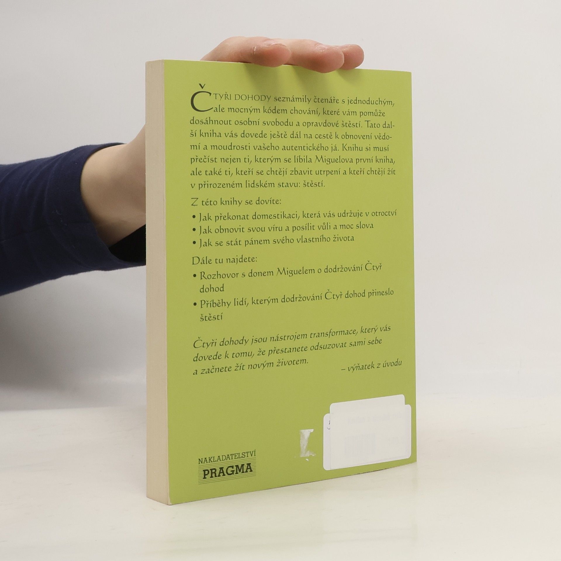 Čtyři dohody seznámily čtenáře s jednoduchým, ale mocným kódem chování, které vám pomůže dosáhnout osobní svobodu a opravdové štěstí. Tato další kniha vás dovede ještě dál na cestě k obnovení vědomí a moudrosti vašeho autentického já. Knihu si musí přečíst nejen ti, kterým se líbila Miguelova první kniha, ale také ti, kteří se chtějí zbavit utrpení a kteří chtějí žít v přirozeném lidském stavu: štěstí.
