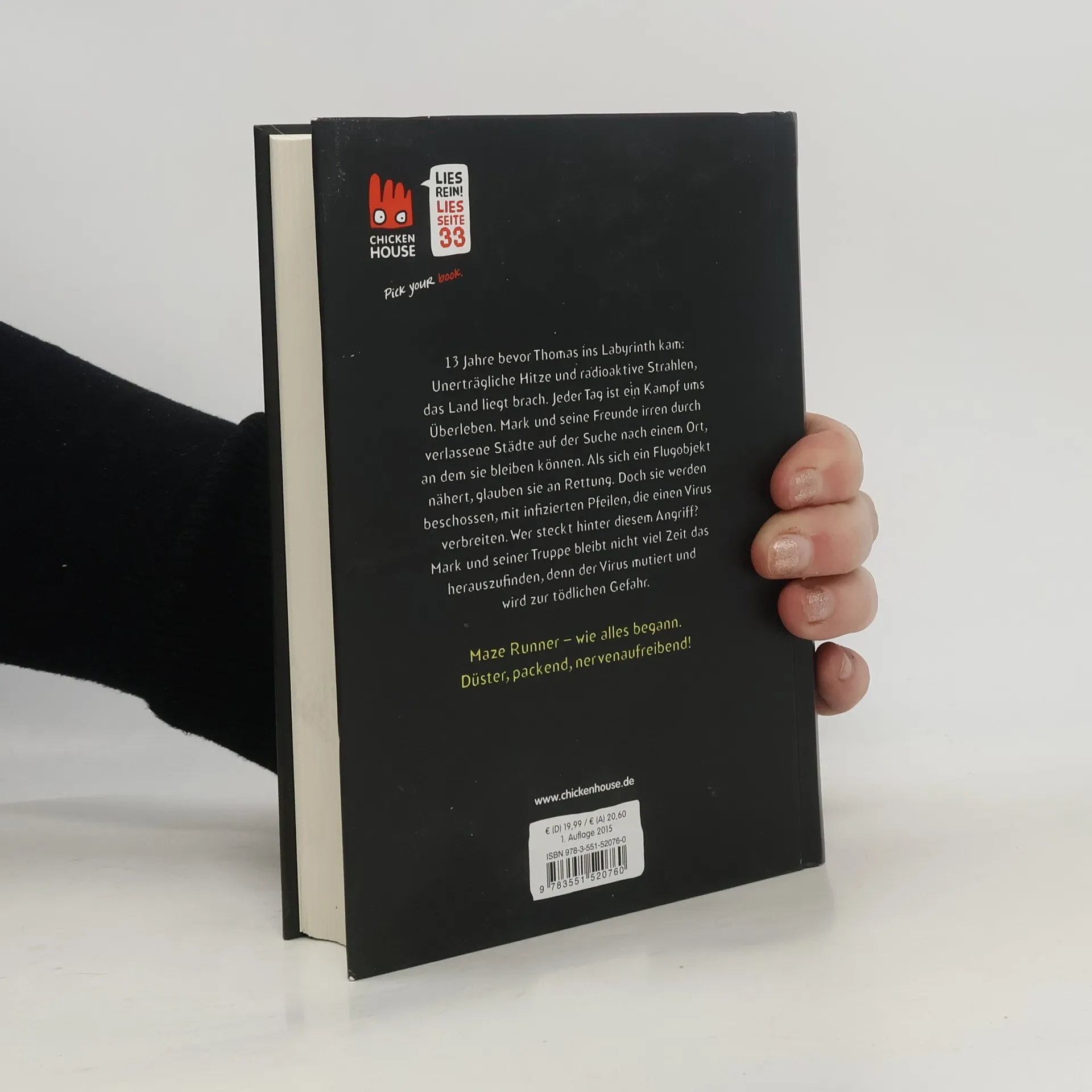 Die Vorgeschichte zur Maze Runner-Trilogie – düster, packend, nervenaufreibend! *** 13 Jahre bevor Thomas ins Labyrinth kam: Unerträgliche Hitze, radioaktive Strahlen und riesige Flutwellen – das Land liegt brach. Jeder Tag ist ein Kampf ums Überleben. Mark und seine Freunde irren durch verlassene Städte auf der Suche nach einem Ort, an dem sie bleiben können. Als sich ein Hubschrauber nähert, glauben sie an Rettung. Doch sie werden beschossen, mit infizierten Pfeilen, die einen Virus verbreiten. Wer tut den Menschen so etwas an? Mark und seiner Truppe bleibt nicht viel Zeit das herauszufinden, denn der Virus mutiert und wird zur tödlichen Gefahr … *** Vorsicht: Spoiler-Alarm für die Trilogie. Alle Bände der weltweiten Bestseller-Serie »Maze Runner«: Die Auserwählten im Labyrinth (Band 1) Die Auserwählten in der Brandwüste (Band 2) Die Auserwählten in der Todeszone (Band 3) Die Auserwählten - Kill Order (Band 4, spielt 15 Jahre vor Band 1) Die Auserwählten - Phase Null (Band 5, spielt unmittelbar vor Band 1)