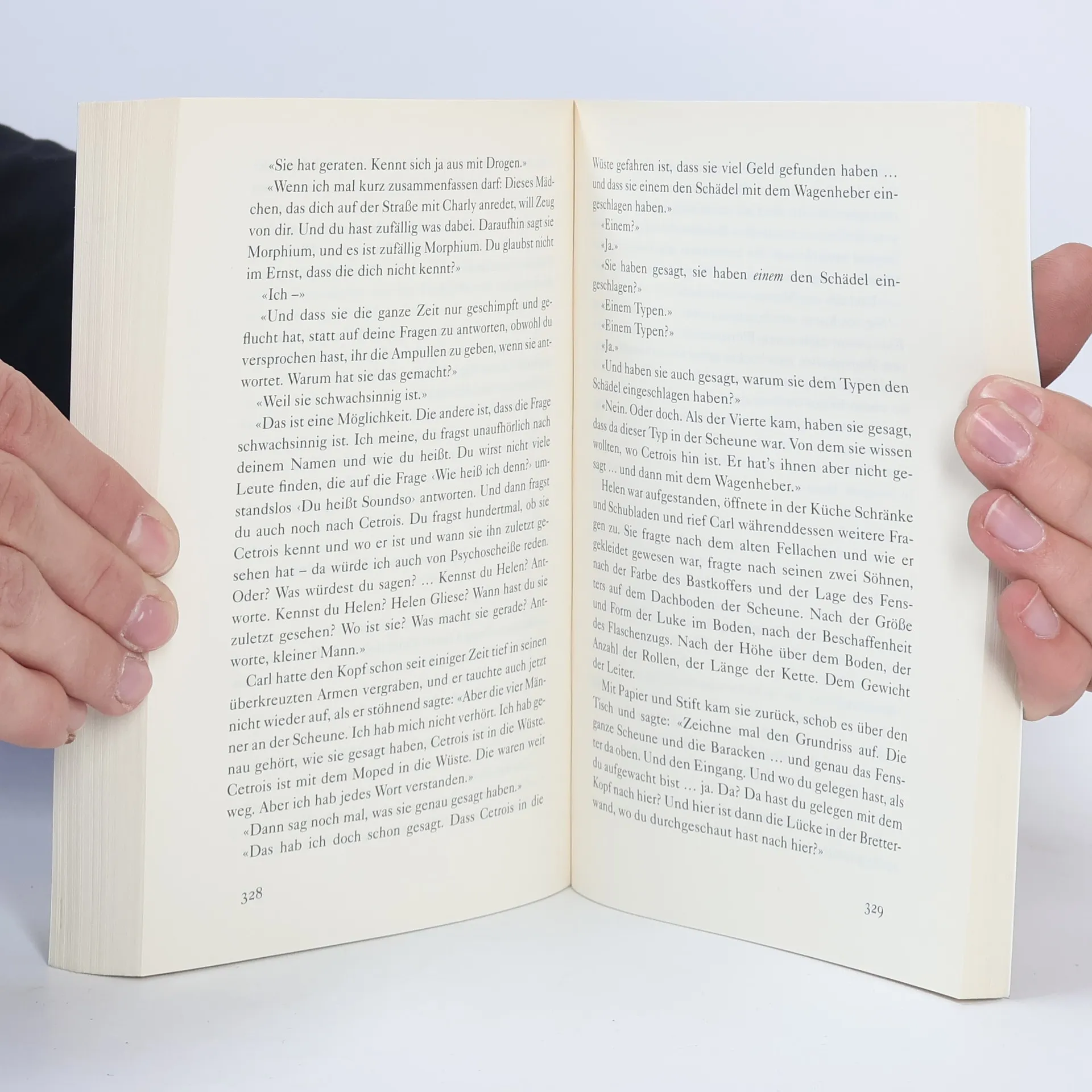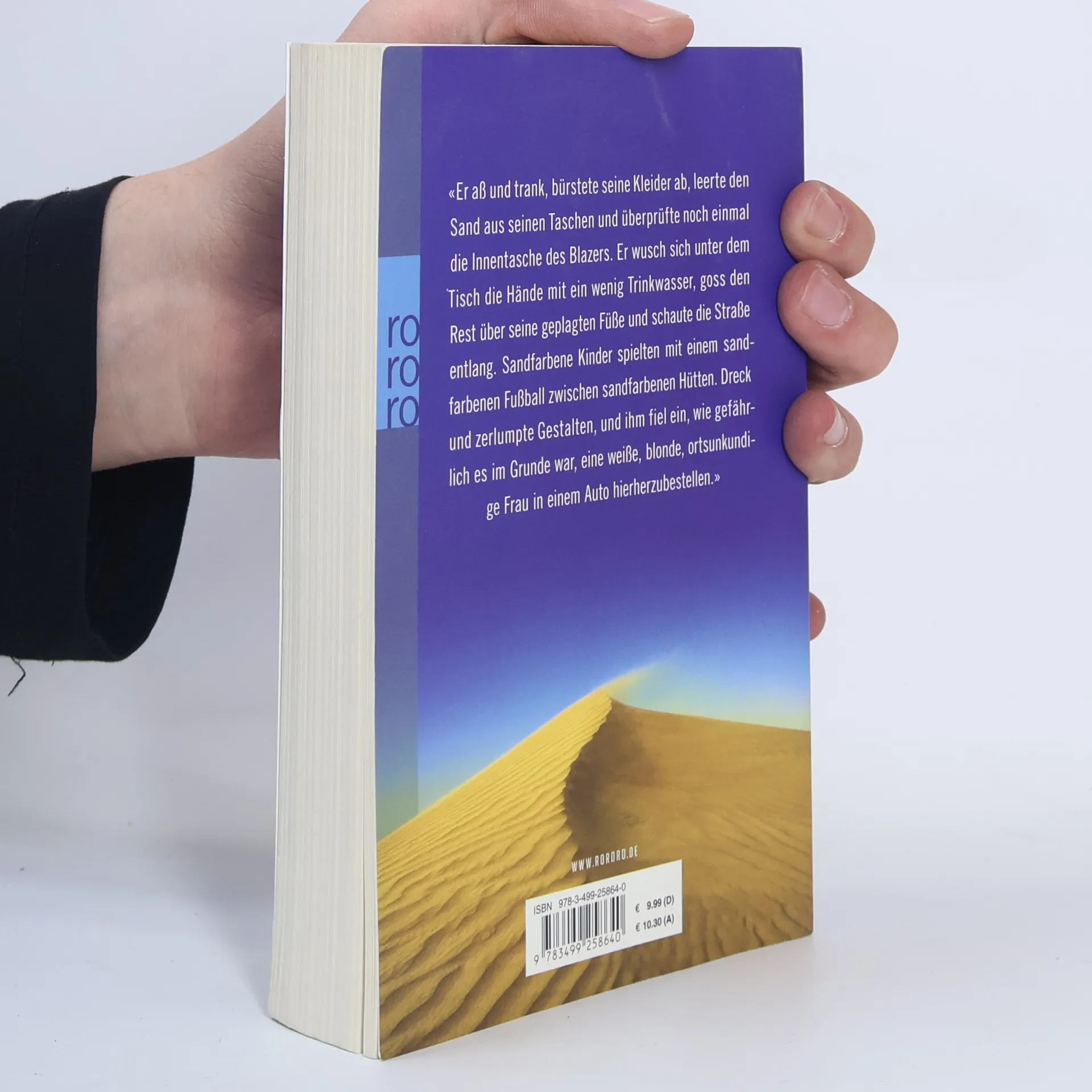 «Er aß und trank, bürstete seine Kleider ab, leerte den Sand aus seinen Taschen und überprüfte noch einmal die Innentasche des Blazers. Er wusch sich unter dem Tisch die Hände mit ein wenig Trinkwasser, goss den Rest über seine geplagten Füße und schaute die Straße entlang. Sandfarbene Kinder spielten mit einem sandfarbenen Fußball zwischen sandfarbenen Hütten. Dreck und zerlumpte Gestalten, und ihm fiel ein, wie gefährlich es im Grunde war, eine weiße, blonde, ortsunkundige Frau in einem Auto hierherzubestellen.»
