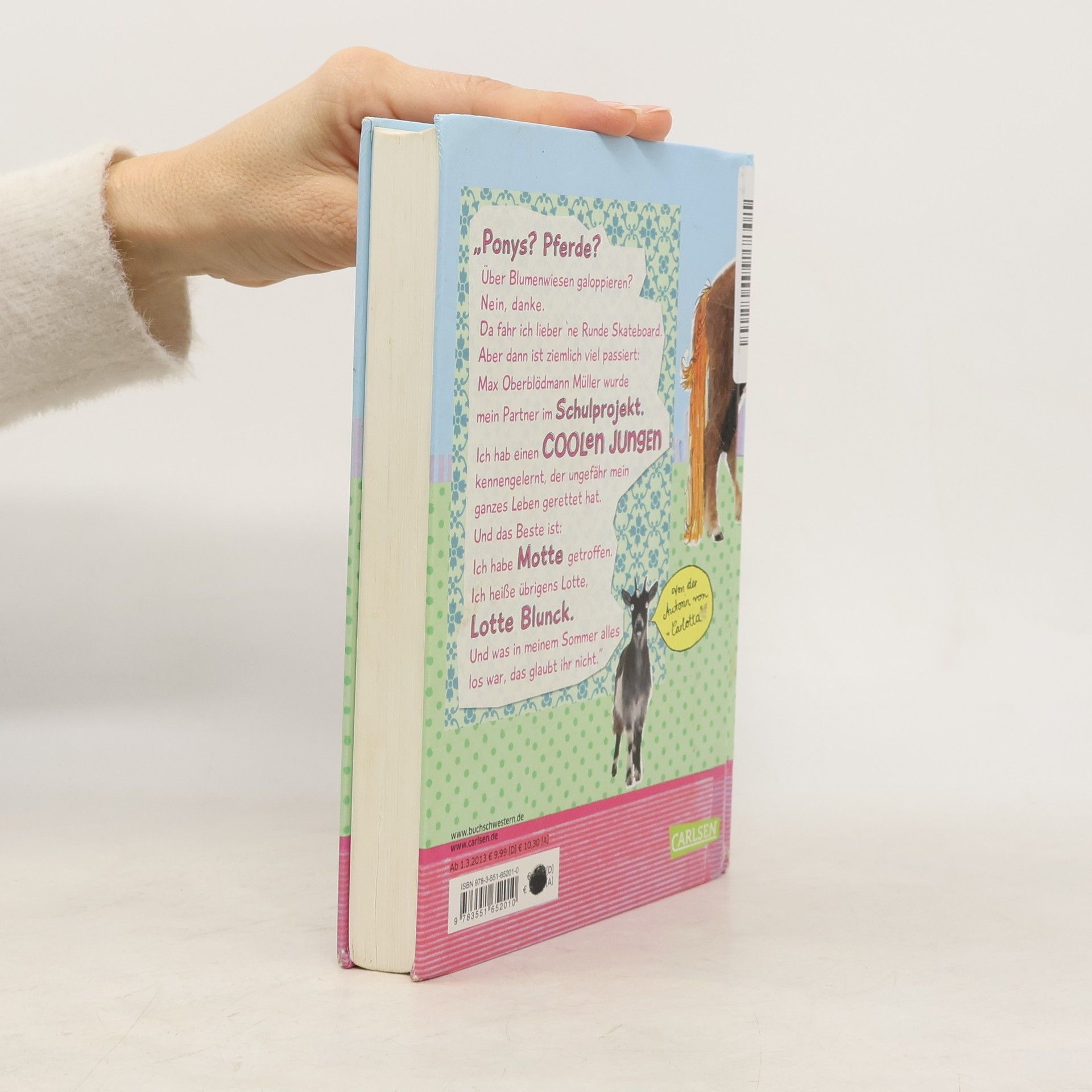 "Ponys? Pferde? Über Blumenwiesen galoppieren? Nein, danke. Ich fahr lieber 'ne Runde Skateboard. Aber dann ist ziemlich viel passiert: Max Oberblödmann Müller wurde mein Partner im Schulprojekt. Ich habe einen coolen Jungen kennengelernt, der ungefähr mein ganzes Leben gerettet hat. Und das Beste: Ich habe Motte getroffen. Ich heiße übrigens Lotte, Lotte Blunck. Und was in meinem Sommer alles los war, das glaubt ihr nicht.„ Nach “Carlotta" die neue Heldin von Dagmar Hoßfeld!
