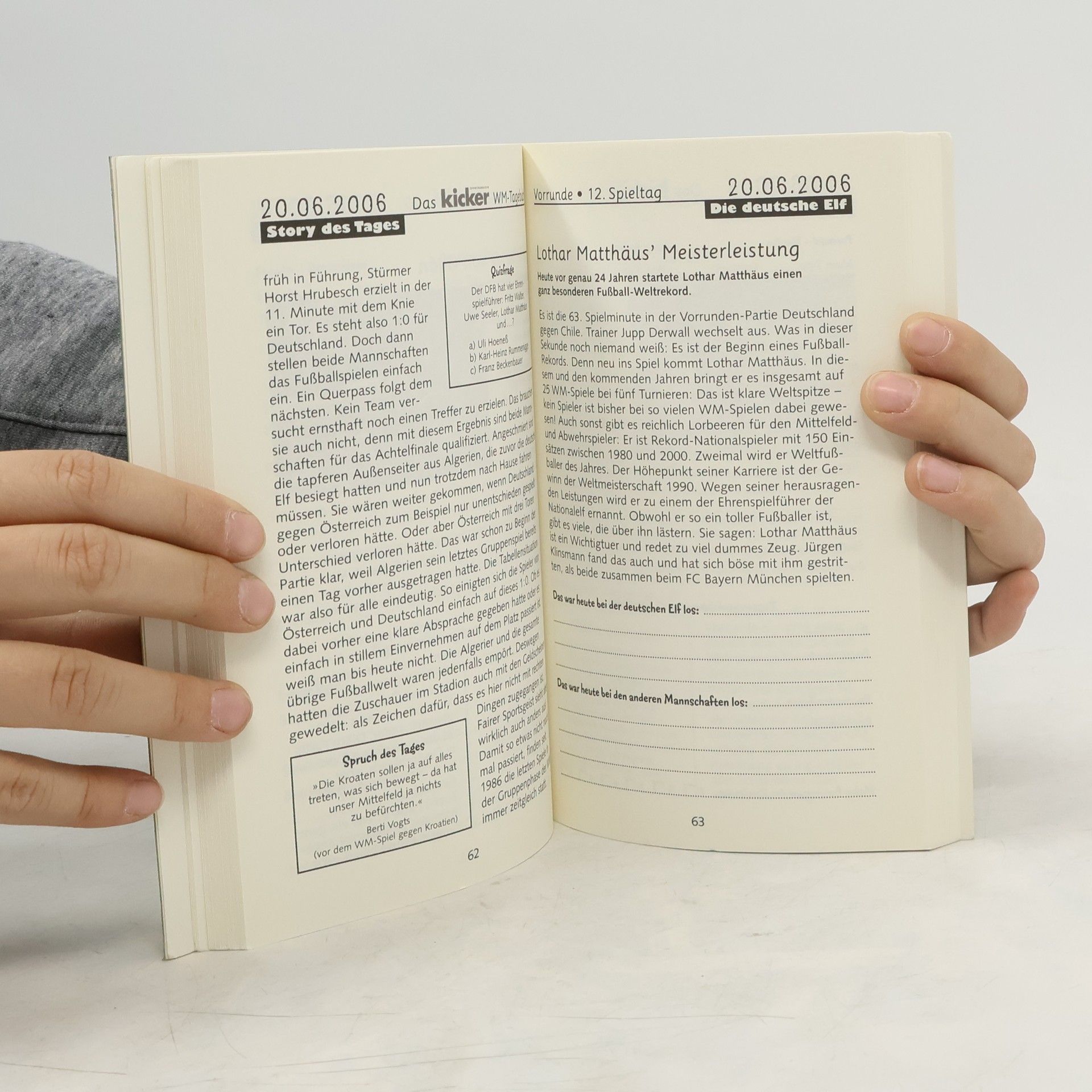 Wie geht das Vorrundenspiel Deutschland gegen Tunesien aus? Wie schlägt sich England gegen die Niederlande? Für wen gibt es gelbe und rote Karten? An welchen Austragungsorten wird gespielt und vor wie vielen Zuschauern im Stadion? Wer ist der Fußballspieler des Tages und warum? Welche Prognosen für die Finalrunden kann man bereits abgeben? Mit dem WM-Tagebuch wird jeder Spieltag zum Ereignis! Es bietet genügend Platz zum Eintragen der wichtigsten Ergebnisse und Begebenheiten, liefert aber auch viele interessante und witzige Hintergrundinfos, Anekdoten etc. rund um den Fußball, die Geschichte der WM und natürlich die deutsche Mannschaft. Mit zwei Doppelseiten für jeden Spieltag und vielen Sonderseiten für das Drumherum. Die erste Fußball-Weltmeisterschaft in Deutschland seit 32 Jahren - ein unvergessliches Ereignis, dokumentiert mit dem WM-Tagebuch!