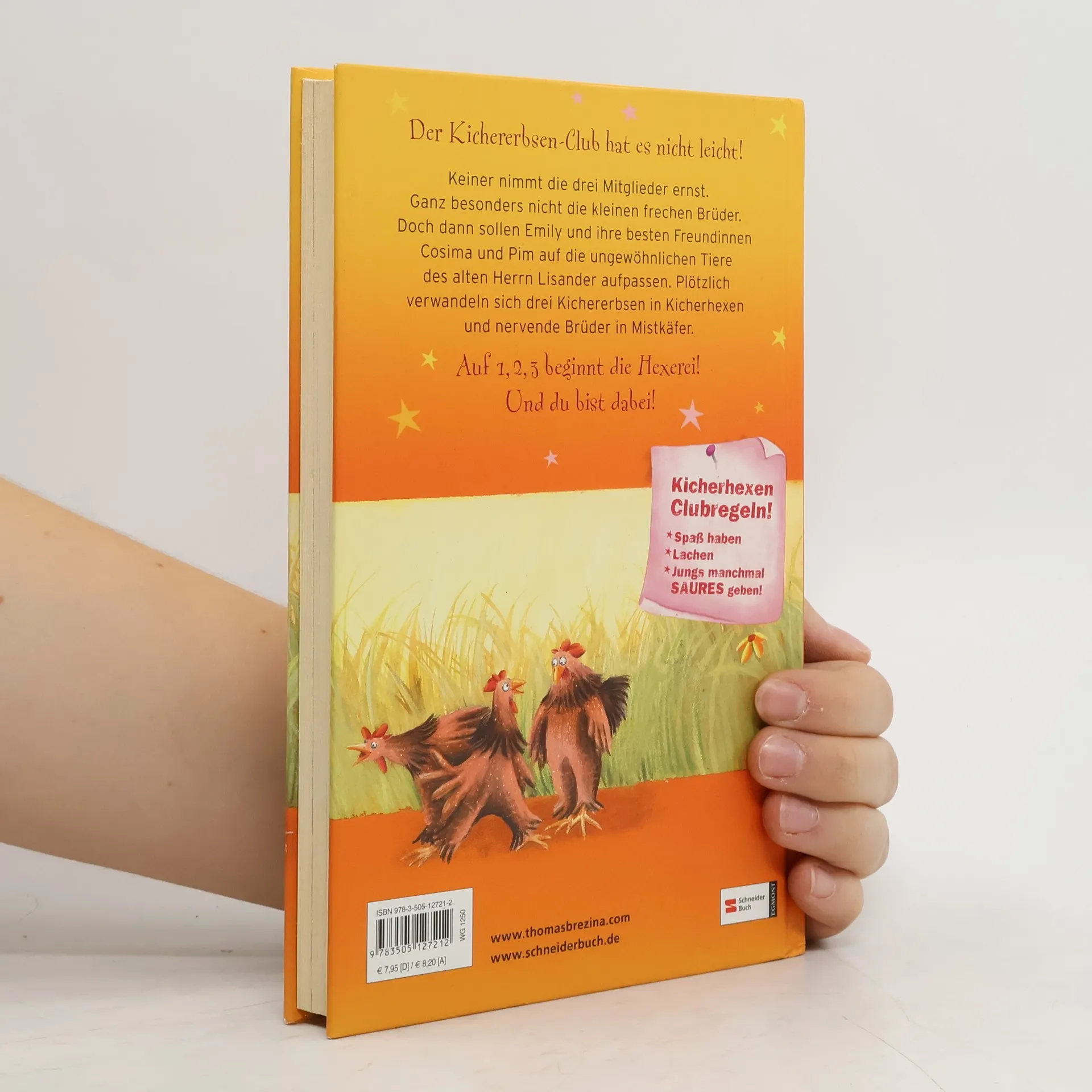 Der Kichererbsen-Club hat es nicht leicht! Keiner nimmt die drei Mitglieder ernst. Ganz besonders nicht die kleinen frechen Brüder. Doch dann sollen Emily und ihre besten Freundinnen Cosima und Pim auf die ungewöhnlichen Tiere des alten Herrn Lisander aufpassen. Plötzlich verwandeln sich drei Kichererbsen in Kicherhexen und nervende Brüder in Mistkäfer. Auf 1, 2, 3, beginnt die Hexerei! Und du bist dabei!