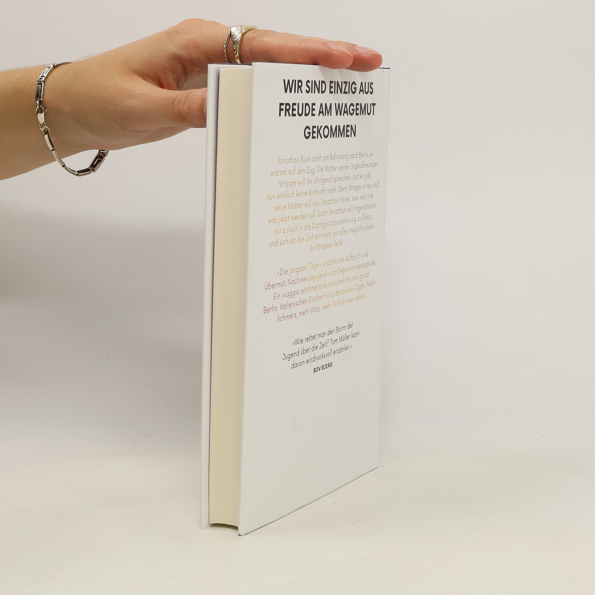 „Wie rettet man den Sturm der Jugend über die Zeit? Tom Müller kann davon eindrucksvoll erzählen.“ (Bov Bjerg) Jonathan Buck steht am Bahnsteig nach Berlin, er wartet auf den Zug. Die Mutter seines Jugendfreundes Strippe will ihn dringend sprechen, und es gibt keine Ausflucht mehr. Denn Strippe ist tot, und seine Mutter will von Jonathan hören, was war und was jetzt werden soll. Das Einzige, was Jonathan will, ist neben Elena im Bett liegen, d'Annunzio lesen, rauchen. Kalte Tomatensuppe löffeln, sich an früher erinnern, an die Berliner Nachwende-Jugend, als alles möglich schien. An Strippes Seite. Vor dreißig Jahren, im Vakuum der Wendejahre, haben sie Sinnlichkeit gesucht und neue Idole. Sie wollten Helden sein im Aufstand der Gefühle. Strippes Tod zwingt Jonathan Gericht zu halten, über sich, die Zeit und seine Träume. Tom Müller erzählt die Geschichte einer Freundschaft, die immer an die Grenzen ging, erzählt von Aufbruch und Übermut, die kein Maß kannten. „Die jüngsten Tage“ ist cool und voller Emphase: eine Reise zwischen Hamburg und Berlin, Kindheitsabenteuern und Gegenwartseskapade, italienischen Dichtern und deutschen Zügen. Mehr Schmerz, mehr Witz, mehr Aufruhr war selten. Ein herausragendes Debüt.