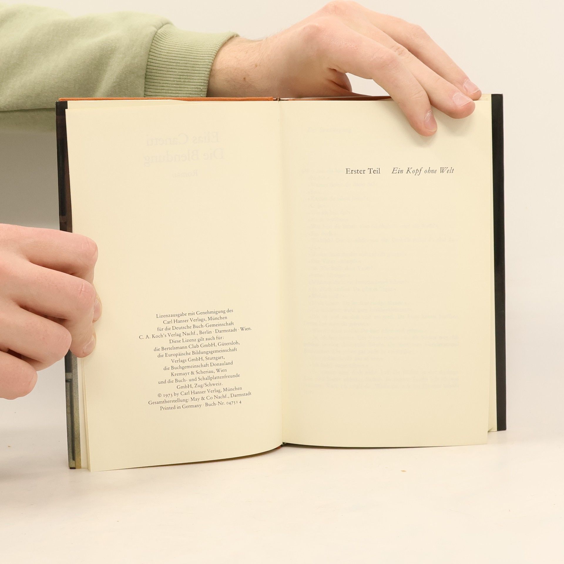 Dieser Roman, 1935 in Wien zum erstenmal veröffentlicht, aber von ungünstigen Zeitumständen in seiner Wirkung behindert, ist auf Umwegen über England, Amerika und Frankreich, in die deutsche Literatur zurückgekehrt, in der er heute einen wichtigen Platz einnimmt. Wie Joyces „Ulysses“, mit dem die Kritik Canettis Buch immer wieder verglichen hat, ist „Die Blendung“ im Grunde eine mächtige Metapher für die Auseinandersetzung des Geistes mit der Wirklichkeit, für Glanz und Elend des einsam reflektierenden Menschen in der Welt. Protagonist der Handlung ist Kien, ein berühmter Sinologe, der in seiner 25 000 Bände umfassenden Bibliothek ein grotesk eigensinniges Höhlenleben führt. Seine Welt ist im Kopf, aber sein Kopf ist ohne Sinn für die Welt. Als Kien, von seiner Haushälterin zur Ehe verführt, mit den Konventionen und Tatsachen des alltäglichen Lebens konfrontiert wird, „rettet“ er sich gewissermaßen in den Irrsinn.