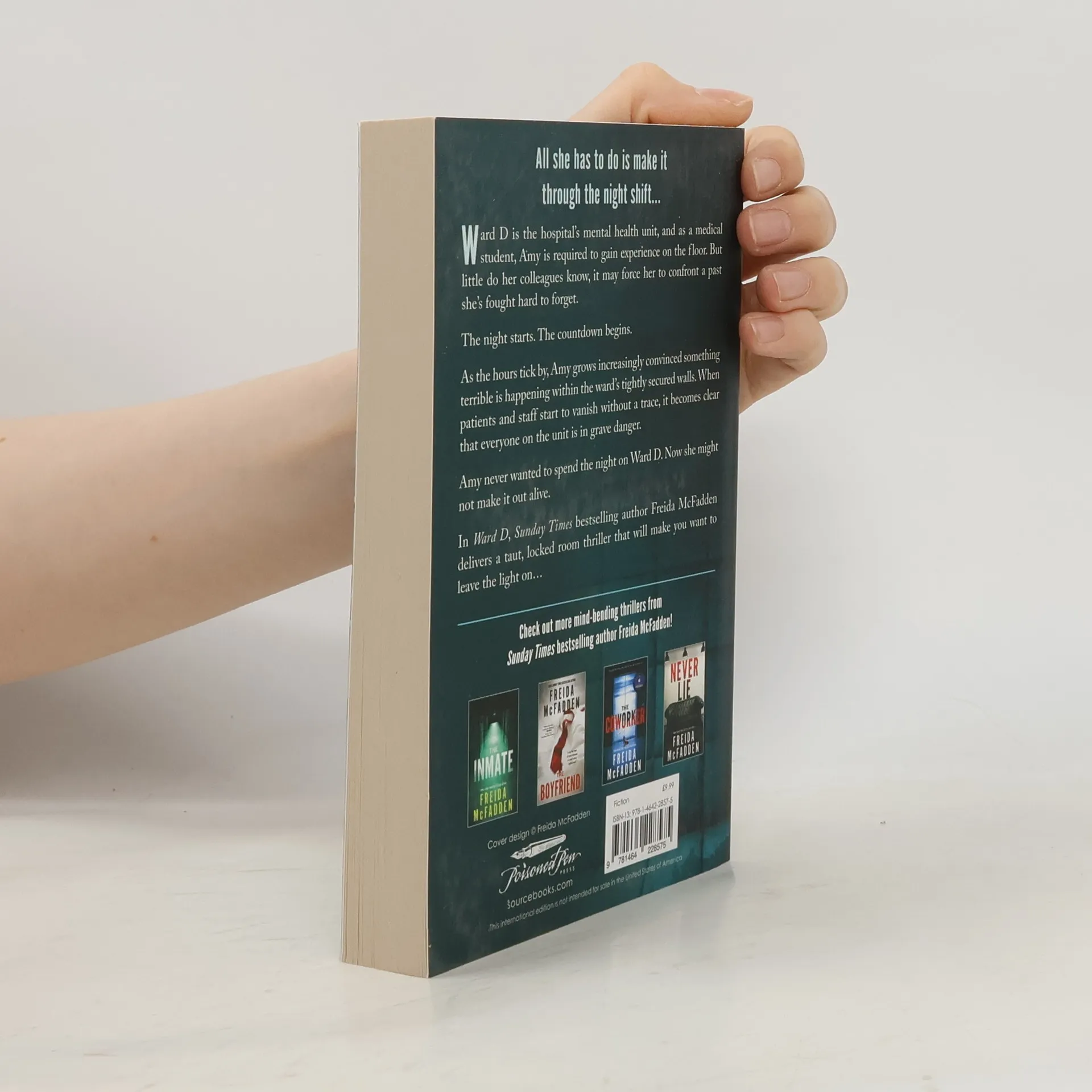 #1 Sunday Times bestselling author Freida McFadden returns with Ward D: a gripping locked room thriller set in an eerie hospital ward. *** Medical student Amy Brenner is spending the night on a locked psychiatric ward. All she has to do is make it through the night shift... Ward D is the hospital's mental health unit and as a medical student, Amy is required to gain experience on the floor. But little do her colleagues know it may force her to confront a past she's fought hard to forget. The night starts. The countdown begins. As the hours tick by, Amy grows increasingly convinced something terrible is happening within the ward's tightly secured walls. When patients and staff start to vanish without a trace, it becomes clear that everyone on the unit is in grave danger. Amy never wanted to spend the night on Ward D. Now, she might not make it out alive. Ward D once again demonstrates why Freida McFadden is the most talked-about voice in contemporary crime fiction, delivering a taut psychological thriller that will have you gripped right to the thrilling final twist. Tropes Claustrophobic Thriller Psychological Locked Room Mystery Thriller Suspense Thriller Survive the Night Also by Freida McFadden: The Crash The Boyfriend The Housemaid is Watching The Perfect Son The Coworker The Locker Door Never Lie The Teacher The Inmate One by One