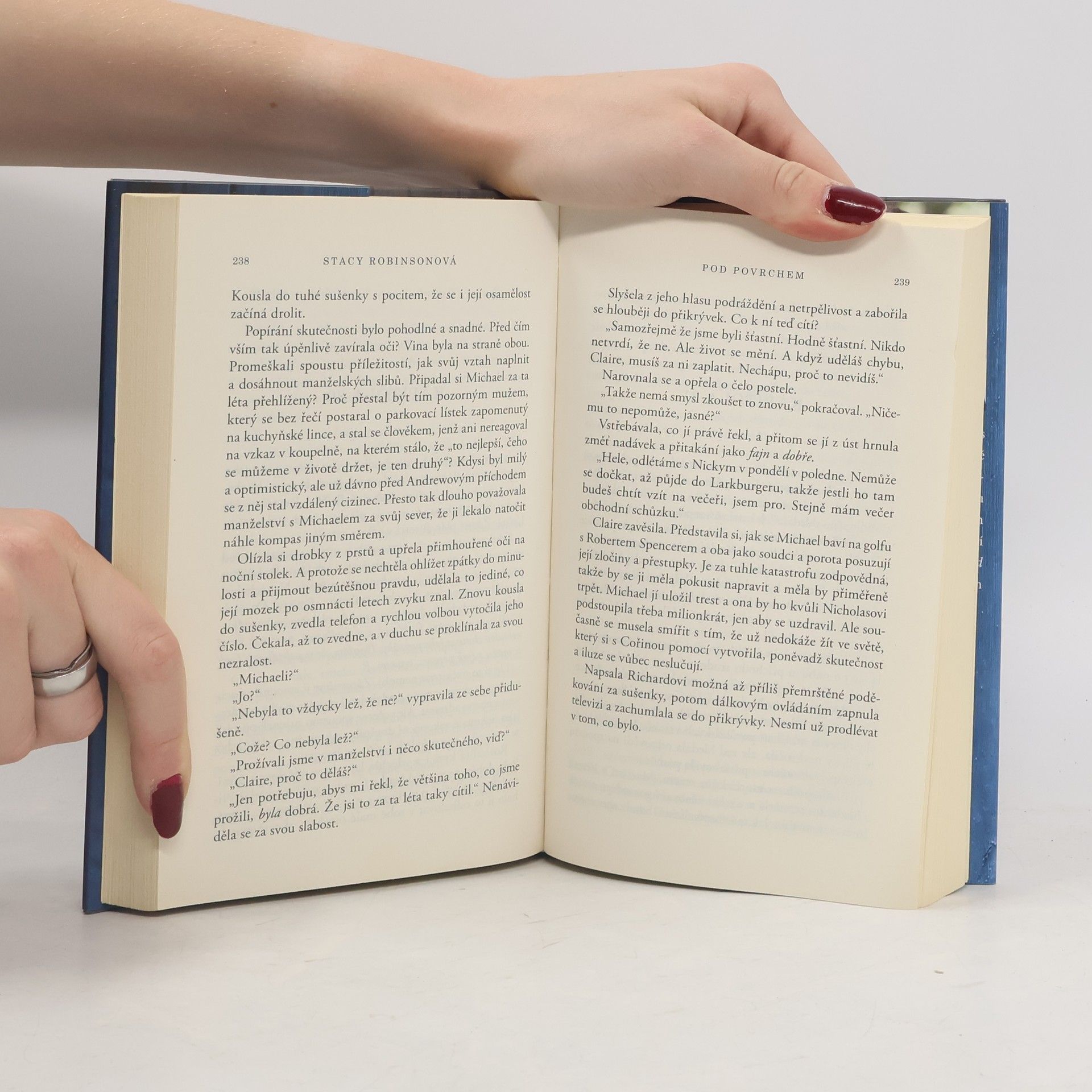 Na první pohled dokonalá rodina - bohatý podnikatel Michael, jeho krásná žena Claire a jejich sedmnáctiletý talentovaný syn Nicholas. Jenomže idyla bere za své ve chvíli, kdy se Nicholas předávkuje drogami a upadne do kómatu a Michael, kvůli němuž se Claire vzdala vlastní kariéry, chce svou ženu opustit. Jenomže Claire v tomto případě není oběť - Nicholas ji načapal při nevěře a Michael ji chce opustit ze stejného důvodu. Nic ovšem není tak tak černobílého, jak se může zdát. Claire odmítne nést celou vinu a svému muži se postaví. Krom černého svědomí, pochybností o životě, o sobě a Michaelovi má totiž navíc také neutuchající vůli. A najednou se začnou z minulosti vynořovat tajemství, která měla raději zůstat zapomenuta… Vynikající psychologické rodinné drama Pod povrchem je debutovým románem Američanky Stacy Robinsonové.