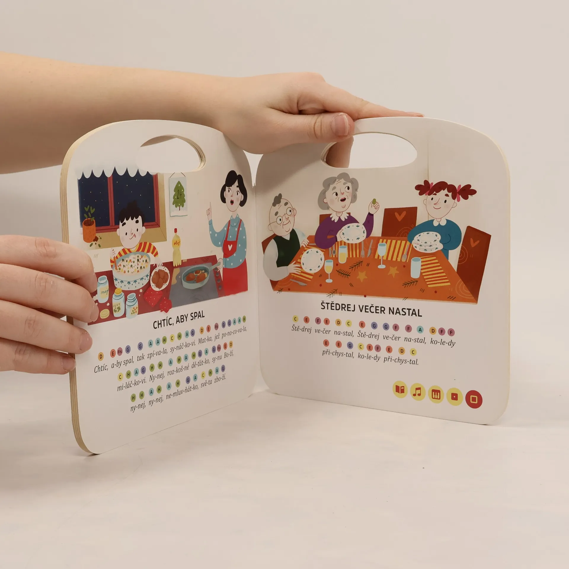 12 českých vánočních koled na doprovází celostránkové ilustrace, texty písní a barevně označené tóny melodie písní. Při použití elektronické tužky Albi kniha ožívá a děti si mohou zahrát vánoční melodie