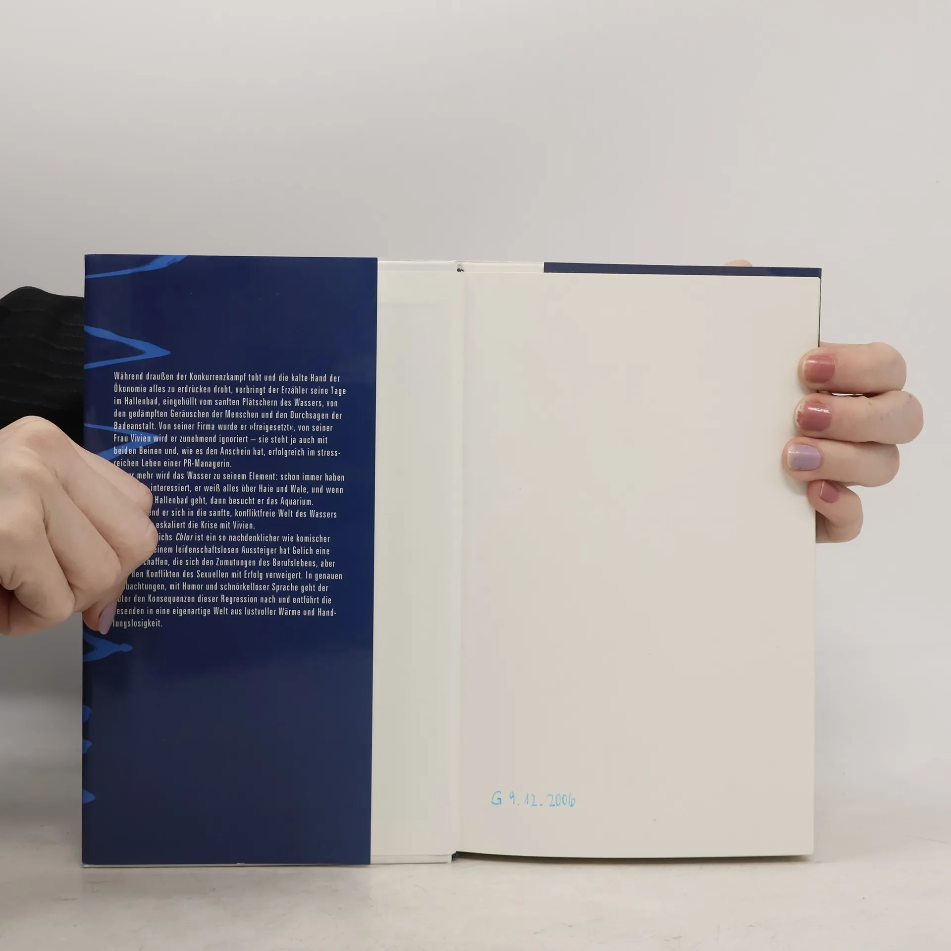 Während draußen der Konkurrenzkampf tobt und die kalte Hand der Ökonomie alles zu erdrücken droht, verbringt der Erzähler seine Tage im Hallenbad, eingehüllt vom sanften Plätschern des Wassers, von den gedämpften Geräuschen der Menschen und den Durchsagen der Badeanstalt. Von seiner Firma wurde er 'freigesetzt', von seiner Frau Vivien wird er zunehmend ignoriert – sie steht ja auch mit beiden Beinen und, wie es den Anschein hat, erfolgreich im stressreichen Leben einer PR-Managerin. Immer mehr wird das Wasser zu seinem Element: schon immer haben ihn Fische interessiert, er weiß alles über Haie und Wale, und wenn er nicht ins Hallenbad geht, dann besucht er das Aquarium. Aber während er sich in die sanfte, konfliktfreie Welt des Wassers zurückzieht, eskaliert die Krise mit Vivien. Johannes Gelichs 'Chlor' ist ein so nachdenklicher wie komischer Roman. In seinem leidenschaftslosen Aussteiger hat Gelich eine Figur erschaffen, die sich den Zumutungen des Berufslebens, aber auch den Konflikten des Sexuellen mit Erfolg verweigert. In genauen Beobachtungen, mit Humor und schnörkelloser Sprache geht der Autor den Konsequenzen dieser Regression nach und entführt die Lesenden in eine eigenartige Welt aus lustvoller Wärme und Handlungslosigkeit.