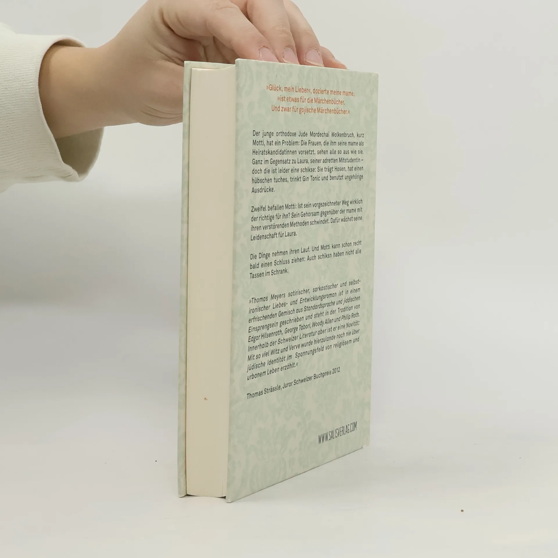 Motti Wolkenbruch lebt noch immer zu Hause, mit seiner geschwätzigen mame und seinem tate, der es seit längerem vorzieht zu schweigen und sich am liebsten hinter der aktuellen Ausgabe des „Tacheles“ versteckt. Die zufällige Begegnung mit einer hübschen Schickse wirft Mottis Leben aus der Bahn; ihm wird bewusst, dass er in seinen Kreisen kein Liebesglück finden wird. Und je mehr seine mame auf ihn einredet, umso stärker regt sich in ihm der Wunsch nach einem mamefreien Leben in den Armen ebendieser Schickse. Schritt für Schritt, manchen auch zurück, tritt Motti aus der orthodoxen Welt heraus in die säkulare, was auch grundlegende Veränderungen an seinem Äußeren mit sich bringt – der Bart kommt ab und die zu kurzen, schwarzen jüdischen Hosen machen modischen Jeans Platz. Mehr und mehr verwandelt sich Motti in einen typischen urbanen jungen Mann. Zwar ist er nun seine mame los, die ihn keines Blickes mehr würdigt, doch mehr Glück mit den Frauen hat er auch nicht. Jene, die er jetzt kennenlernt, haben wohl keinen dicken tuches, aber dafür nicht alle Tassen im Schrank. Thomas Meyers Roman führt auf unterhaltsame und kurzweilige Weise sozusagen vom orthodoxen A zum säkularen B, wobei sich an den Problemen mit den Frauen tendenziell bloß ändert, dass sie keine jüdischen Namen mehr tragen