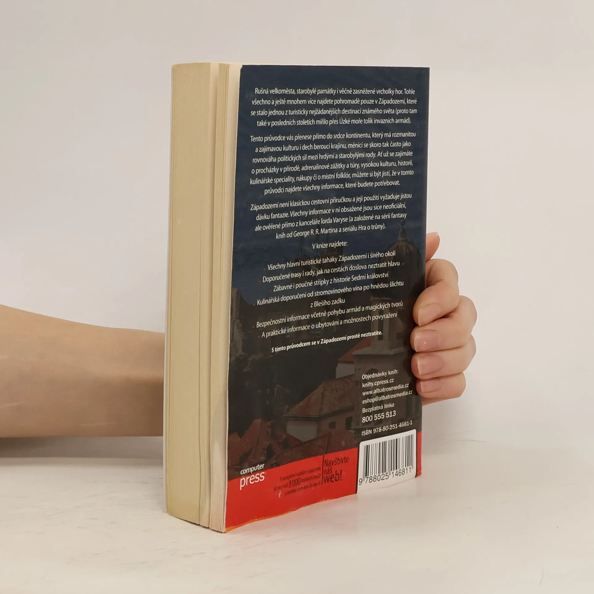 Rušná velkoměsta, starobylé památky a zasněžené vrcholky hor – to vše najdete v Západozemí, jedné z nejžádanějších turistických destinací. Tento průvodce vás zavede do srdce kontinentu s rozmanitou kulturou a dechberoucí krajinou, jejíž proměnlivost odráží politické síly mezi hrdými rody. Ať už vás zajímají přírodní procházky, adrenalinové zážitky, historie, kulinářské speciality, nákupy nebo folklór, v průvodci naleznete všechny potřebné informace. Není to klasická příručka, ale vyžaduje dávku fantazie. Všechny informace jsou ověřené z kanceláře lorda Varyse a vycházejí ze série fantasy knih a seriálu Hra o trůny. V knize najdete: • Hlavní turistické atrakce Západozemí a okolí • Doporučené trasy a rady, jak neztratit hlavu • Zábavné a poučné historické střípky • Kulinářská doporučení od vína po místní speciality • Bezpečnostní informace o pohybu armád a magických bytostí • Praktické informace o ubytování a možnostech zábavy. S tímto průvodcem se v Západozemí prostě neztratíte.