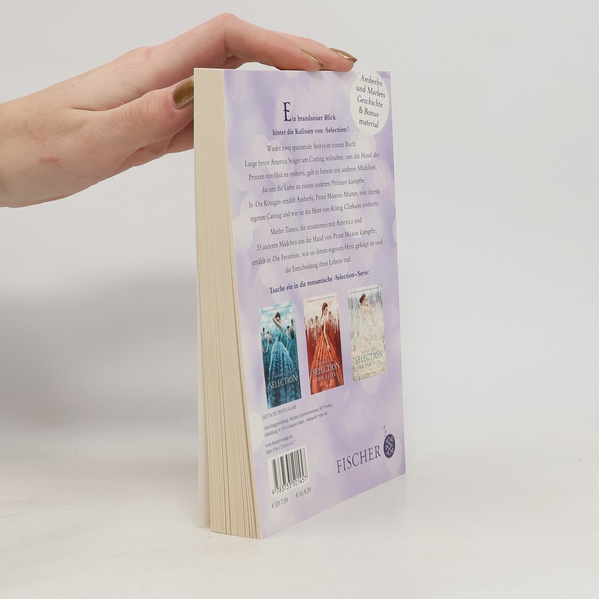 EIN MUSS FÜR JEDEN ›SELECTION‹-FAN! Wieder zwei spannende Storys in einem Buch: Lange bevor America Singer am Casting teilnahm, um die Hand des Prinzen von Illéa zu erobern, gab es bereits ein anderes Mädchen, das um die Liebe zu einem anderen Prinzen kämpfte. In ›Die Königin‹ erzählt Amberley, Prinz Maxons Mutter, von ihrem eigenen Casting und wie sie das Herz von König Clarkson eroberte. Marlee Tames, die zusammen mit America und 33 anderen Mädchen um die Hand von Prinz Maxon kämpfte, erzählt in ›Die Favoritin‹, wie sie ihrem eigenen Herz gefolgt ist und die Entscheidung ihres Lebens traf. Spannende und unentbehrliche Hintergrund-Informationen für alle, die mehr über die ›Selection‹-Welt erfahren wollen