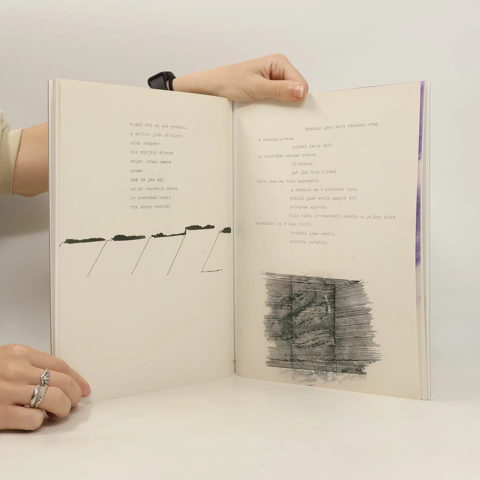Básně Antonína Bezděka psané na ruční papír a přímo na něm ilustrované, či doslova překreslené Václavem Stratilem, vznikaly v letech 1982–1985. Vystaveny byly polooficiálně v Brně v roce 1987, nyní vycházejí ve sličné knižní úpravě, v původním rozměru i barevnosti.Základní situace mnohých Bezděkových textů je pro Václava Stratila „modelem“ střetnutí: šrafura se náhle příčí, černá a bílá a nažloutlá se rozpolcují „chrlíce či chytajíce písmena“. Pointa básně, ať už vyostřená anebo tzv. otevřený konec nalézají variabilní výtvarné samoznaky.Kresba není přívěskem textu, text kresbu nedoplňuje, princip zdobnosti je tu nulový. Kresba a slovo se totiž vzájemně interpretují a vzniká „něco třetího“.