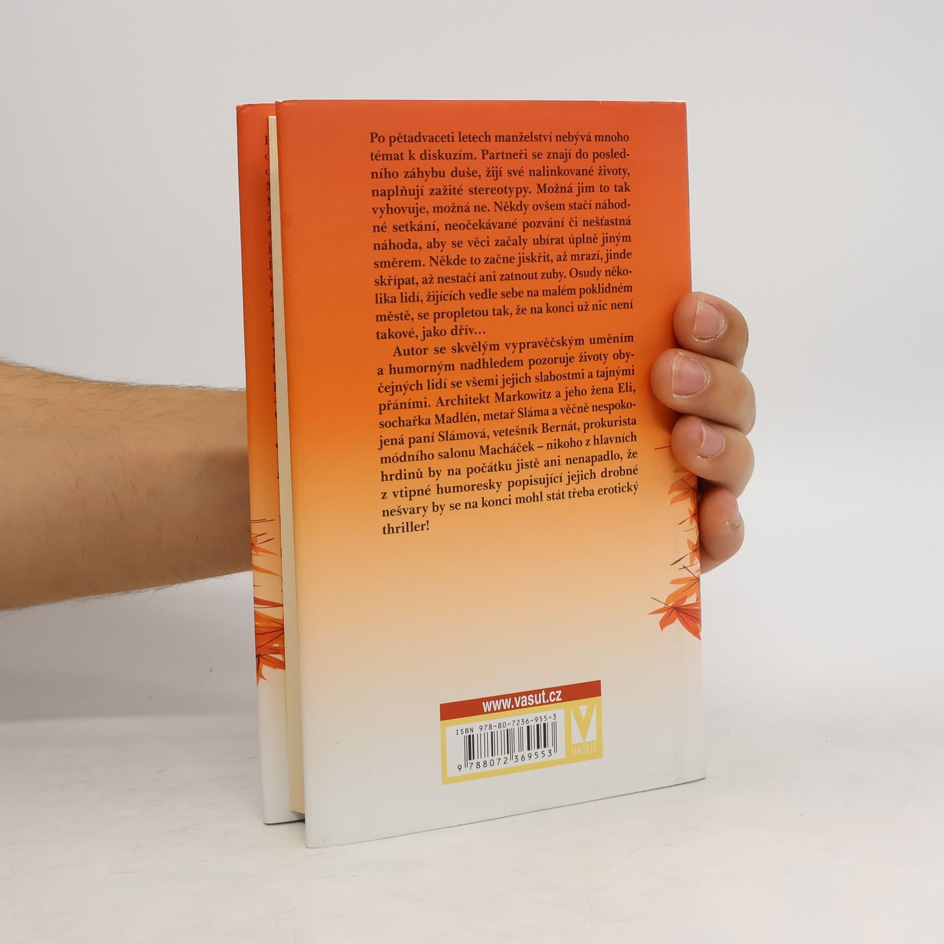 Po pětadvaceti letech manželství nebývá mnoho témat k diskuzím. Partneři se znají do posledního záhybu duše, žijí své nalinkované životy, naplňují zažité stereotypy. Možná jim to tak vyhovuje, možná ne. Někdy ovšem stačí náhodné setkání, neočekávané pozvání či nešťastná náhoda, aby se věci začaly ubírat úplně jiným směrem. Někde to začne jiskřit, až mrazí, jinde skřípat, až nestačí ani zatnout zuby. Osudy několika lidí, žijících vedle sebe na malém poklidném městě, se propletou tak, že na konci už nic není takové, jako dřív… Autor se skvělým vypravěčským uměním a humorným nadhledem pozoruje životy obyčejných lidí se všemi jejich slabostmi a tajnými přáními. Architekt Markowitz a jeho žena Eli, sochařka Madlén, metař Sláma a věčně nespokojená paní Slámová, vetešník Bernát, prokurista módního salonu Macháček – nikoho z hlavních hrdinů by na počátku jistě ani nenapadlo, že z vtipné humoresky popisující jejich drobné nešvary by se na konci mohl stát třeba erotický thriller!