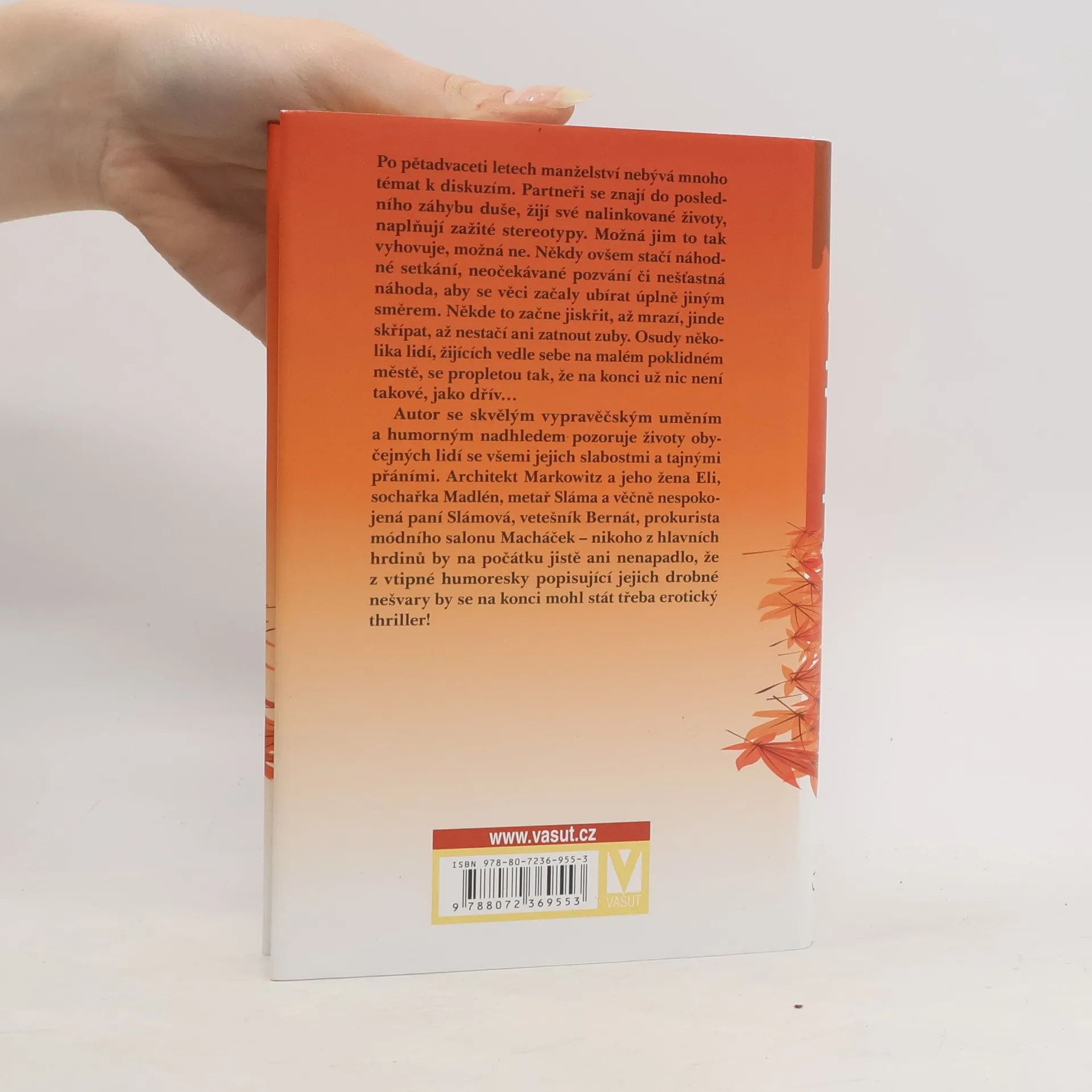 Po pětadvaceti letech manželství nebývá mnoho témat k diskuzím. Partneři se znají do posledního záhybu duše, žijí své nalinkované životy, naplňují zažité stereotypy. Možná jim to tak vyhovuje, možná ne. Někdy ovšem stačí náhodné setkání, neočekávané pozvání či nešťastná náhoda, aby se věci začaly ubírat úplně jiným směrem. Někde to začne jiskřit, až mrazí, jinde skřípat, až nestačí ani zatnout zuby. Osudy několika lidí, žijících vedle sebe na malém poklidném městě, se propletou tak, že na konci už nic není takové, jako dřív… Autor se skvělým vypravěčským uměním a humorným nadhledem pozoruje životy obyčejných lidí se všemi jejich slabostmi a tajnými přáními. Architekt Markowitz a jeho žena Eli, sochařka Madlén, metař Sláma a věčně nespokojená paní Slámová, vetešník Bernát, prokurista módního salonu Macháček – nikoho z hlavních hrdinů by na počátku jistě ani nenapadlo, že z vtipné humoresky popisující jejich drobné nešvary by se na konci mohl stát třeba erotický thriller!