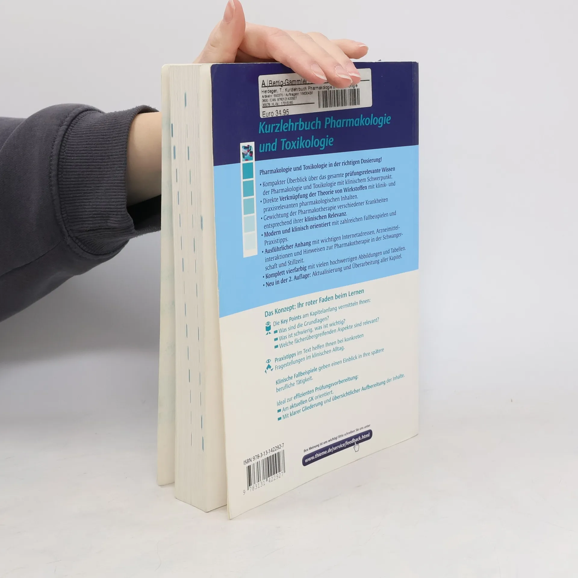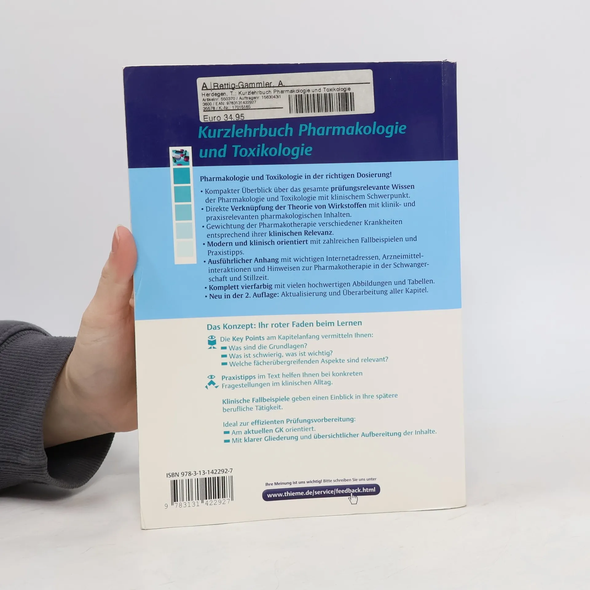 Pharmakologie und Toxikologie in der richtigen Dosierung! Kompakter Überblick über das gesamte prüfungsrelevante Wissen der Pharmakologie und Toxikologie mit klinischem Schwerpunkt. Direkte Verknüpfung der Theorie von Wirkstoffen mit klinik- und praxisrelevanten pharmakologischen Inhalten. Gewichtung der Pharmakotherapie verschiedener Krankheiten entsprechend ihrer klinischen Relevanz. Modern und klinisch orientiert mit zahlreichen Fallbeispielen und Praxistipps. Ausführlicher Anhang mit wichtigen Internetadressen, Arzneimittelinteraktionen und Hinweisen zur Pharmakotherapie in der Schwangerschaft und Stillzeit. Komplett vierfarbig mit vielen hochwertigen Abbildungen und Tabellen. + Campus: Dieses Buch kannst Du sofort online und mobil nutzen! Mit Campus, der Online-Plattform, die Deinen Browser und/oder Dein iPad zur interaktiven Bibliothek macht. Schalte Dir mit dem beiliegenden Code das Buch auf www. campus. thieme. de und in der Campus iPad App frei und nutze die vielen Vorteile von Campus.