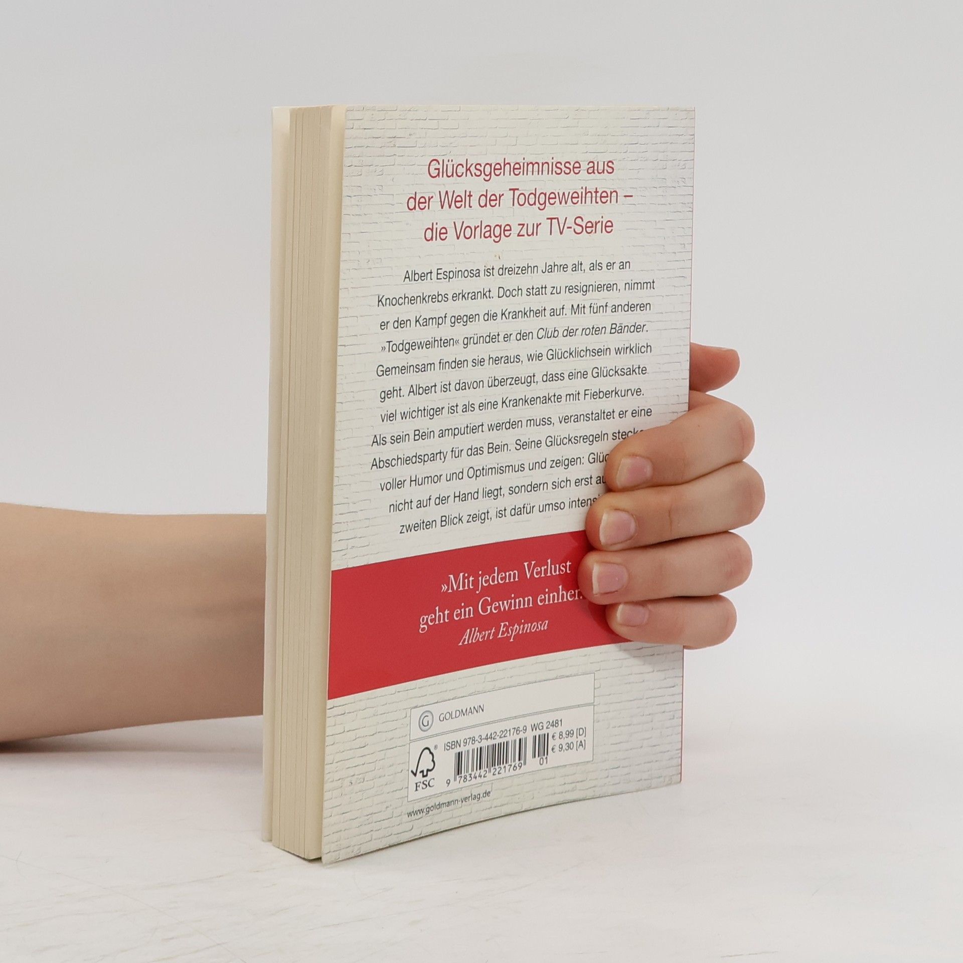 Der internationale Bestseller - die wahre Geschichte hinter der VOX-TV-Serie Albert Espinosa ist vierzehn Jahre alt, als er an Knochenkrebs erkrankt. Doch statt zu resignieren, nimmt er den Kampf gegen die Krankheit auf. Mit fünf anderen „Todgeweihten“ gründet er den Club der roten Bänder. Gemeinsam finden sie heraus, wie Glücklichsein wirklich geht. Albert ist davon überzeugt, dass eine Glücksakte viel wichtiger ist als eine Krankenakte mit Fieberkurve. Als sein Bein amputiert werden muss, veranstaltet er eine Abschiedsparty für das Bein. Seine Glücksregeln stecken voller Humor und Optimismus und zeigen: Glück, das nicht auf der Hand liegt, sondern sich erst auf den zweiten Blick zeigt, ist dafür umso intensiver. Diese Ausgabe ist inhaltlich identisch mit der Ausgabe Espinosa, Glücksgeheimnisse aus der gelben Welt.