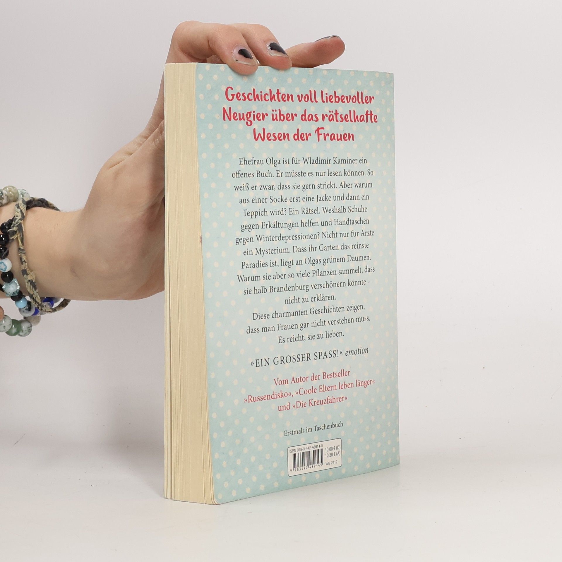 Geschichten voll liebevoller Neugier über das rätselhafte Wesen der Frauen Ehefrau Olga ist für Wladimir Kaminer ein offenes Buch. Er müsste es nur lesen können. So weiß er zwar, dass sie gern strickt. Aber warum aus einer Socke erst eine Jacke und dann ein Teppich wird? Ein Rätsel. Weshalb Schuhe gegen Erkältungen helfen und eine Handtasche gegen Winterdepressionen? Nicht nur für Ärzte ein Mysterium. Dass ihr Garten das reinste Paradies ist, liegt an Olgas grünem Daumen. Warum sie aber so viele Pflanzen sammelt, dass sie halb Brandenburg damit verschönern könnte – nicht zu erklären. Aber das macht nichts, denn Kaminers charmante Geschichten zeigen, dass man Frauen gar nicht verstehen muss. Es reicht völlig, sie zu lieben.