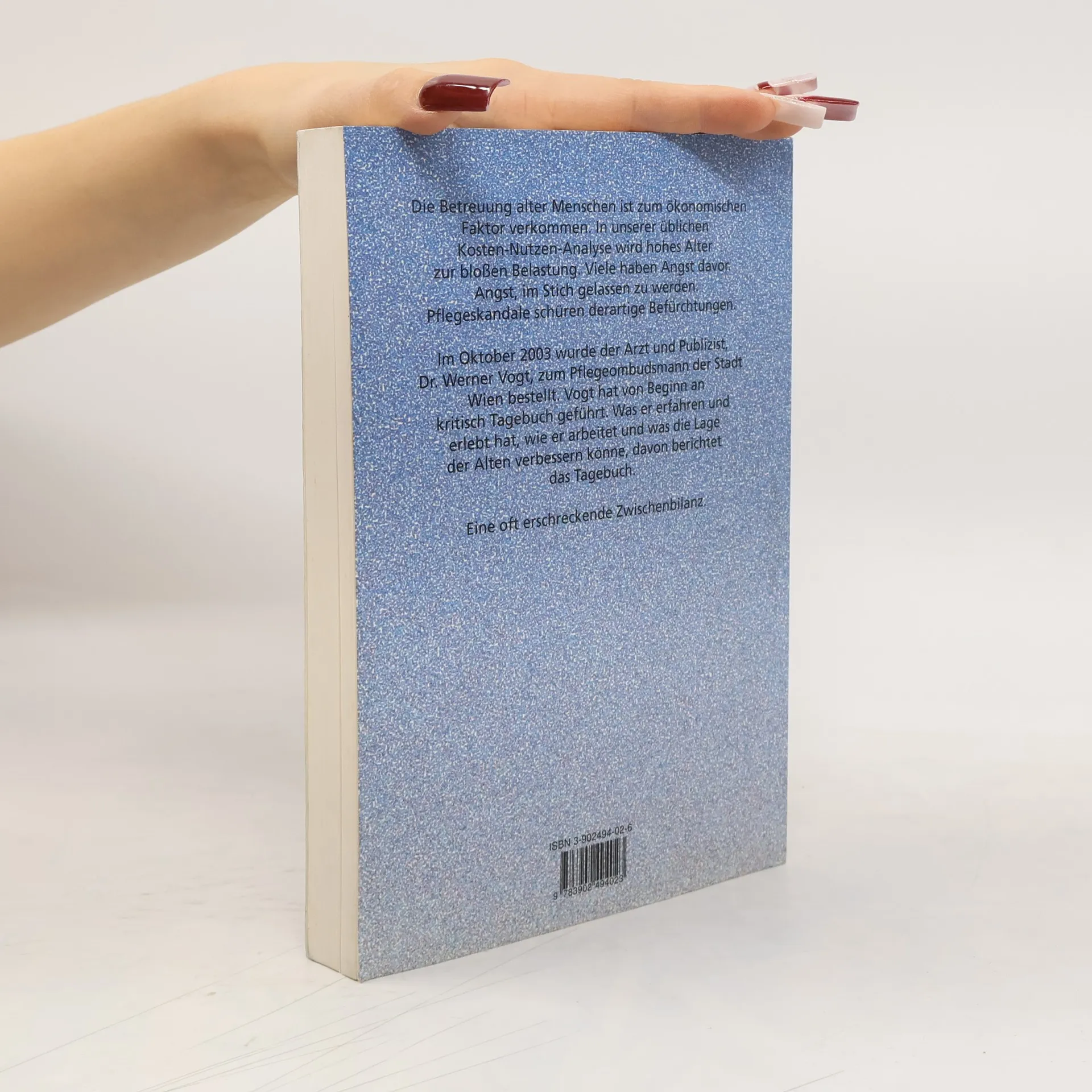 Wenige politische Fragen haben in der letzten Zeit so viel Aufregung erzeugt wie die besondere Problematik der Betreuung alter Menschen. Die Zahl pflegebedürftiger Personen wächst von Jahr zu Jahr. Allein in Wien sind es insgesamt 85 öffentliche und private Geriatriezentren, in denen Tausende alte Menschen gepflegt werden. Die Schwierigkeiten der Pflege und immer wieder auftauchenden Fälle dramatischer Missstände rund um Altenpflege beunruhigen die Öffentlichkeit. Der im Oktober 2003 vom Magistrat zum Wiener-Pflegeombudsmann ernannte Facharzt Dr. Werner Vogt verfasste seit Beginn seiner Arbeit als Ombudsmann ein kritisches Tagebuch, das dokumentiert, wo konkrete Probleme der Altenpflege liegen. Der erfahrene Arzt zieht eine erschreckend realistische Zwischenbilanz und weist auf mögliche Lösungen.