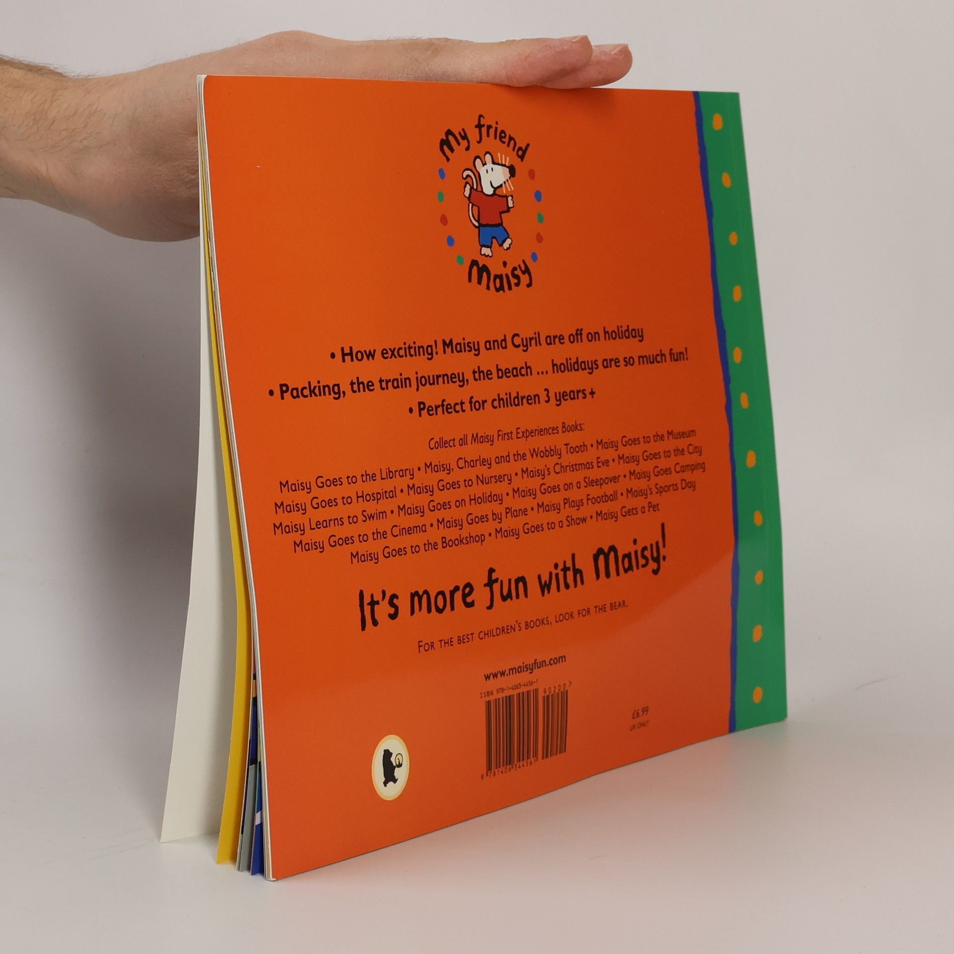 Maisy’s packing her bags and setting off on a fun vacation in a story that’s perfect for young children making a trip away from home. How exciting! Maisy has put her sun hat, pajamas, toothbrush, and camera into a bag, and she’s off to the train station with Panda and Cyril. They’re headed for the seashore, but getting there is only half the fun. Coloring and snacks help pass the time on the ride to the beach, where Maisy can’t wait to swim, collect seashells, build sandcastles, and lots more. At nighttime it feels special to go to bed in a hotel—knowing that tomorrow another vacation day awaits!