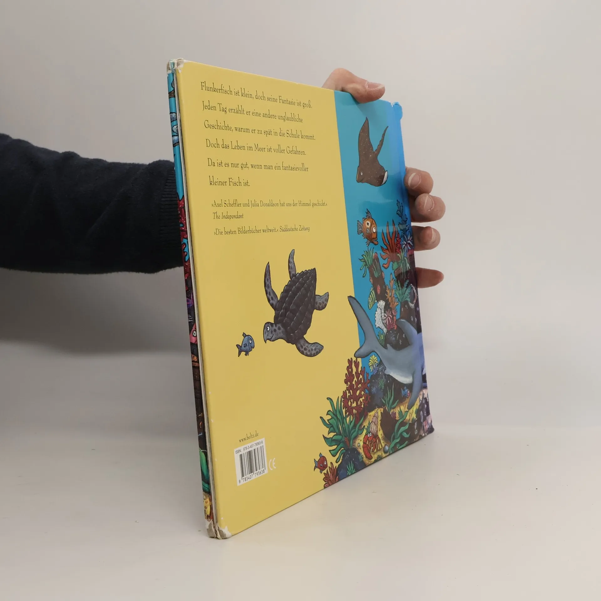 Flunkerfisch ist klein, doch seine Fantasie ist groß. Und das kann lebenswichtig sein. Ein unvergleichliches Bilderbuch, in Reimen erzählt, mit wundervollen Bildern von Axel Scheffler und Julia Donaldson, deren “Grüffelo” es weltweit in millionenfacher Auflage gibt. Flunkerfisch ist klein, doch seine Fantasie ist groß. Jeden Tag erzählt er eine andere unglaubliche Geschichte, warum er zu spät in die Schule kommt: dass er auf einem Seepferdchen ritt, mit Delfinen tauchte oder in einer Schatztruhe gefangen war. Doch das Leben im Meer ist voller Gefahren. Da ist es nur gut, wenn man ein fantasievoller kleiner Fisch ist. Eine Ode an die Fantasie von kleinen Kindern. Ein Klassiker zum Vorlesen von den Schöpfern des weltberühmten »Grüffelo«.