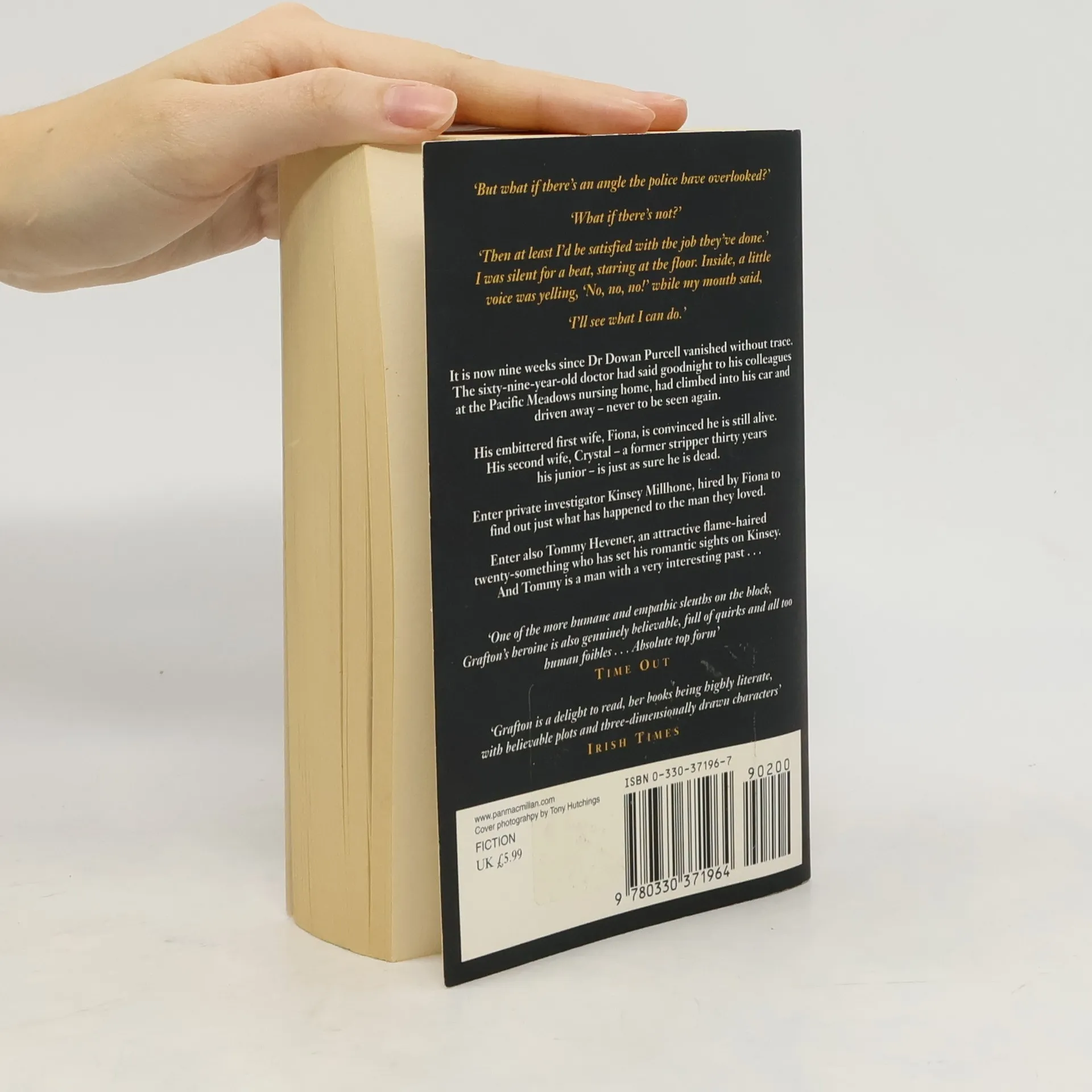 It is now nine weeks since Dr Dowan Purcell vanished without trace. The sixty-nine-year-old doctor had said goodnight to his colleagues at the Pacific Meadows nursing home, had climbed into his car and driven away - never to be seen again. His embittered first wife Fiona is convinced he is still alive. His second wife, Crystal - a former stripper forty years his junior - is just as sure he is dead. Enter private investigator Kinsey Malone, hired by Fiona to find out just what has happened to the man they loved. Enter also Tommy Hevener, an attractive flame-haired twenty-something who has set his romantic sights on Kinsey. And Tommy is a man with a very interesting past ... 'Grafton is a delight to read, her books being highly literatre, with believable plots and three-dimensionally drawn characters'" Irish Times."