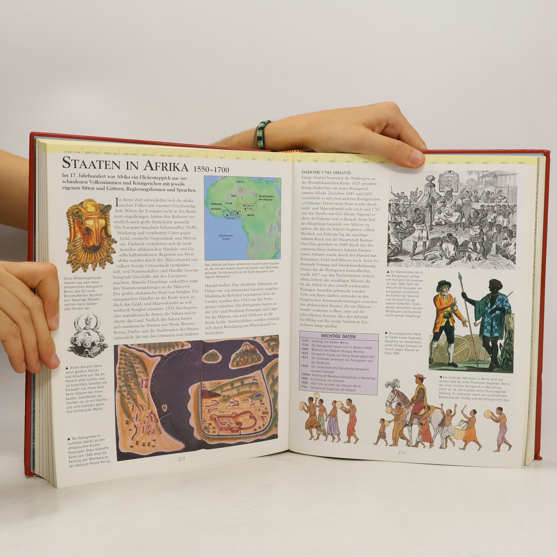 Die Geschichte der Menschheit in einem Band: Das schwere Lexikon mit fast 500 Seiten führt uns vom Auftauchen der ersten Menschen durch alle Kulturen, durch die Antike, das Mittelalter, die Renaissance usw. bis ins heutige Zeitalter. Ein ausführliches Verzeichnis informiert gleich zu Beginn des Lexikons über seinen Inhalt. Die vielen interessanten Farbfotos und -bilder machen das Buch so attraktiv, dass die Lust geweckt wird zum Blättern und Lesen. Die Texte sind kurz gehalten und gut verständlich. Am oberen Rand jeder Doppelseite befindet sich eine Jahrhundertleiste. Mit roter Linie ist die jeweilige Epoche eingetragen, um das Verhältnis dieser Zeit zur ganzen Menschheitsgeschichte zu markieren. Im Anhang finden wir noch ein kleines Lexikon mit der Übersicht der ägyptischen und chinesischen Dynastien, mit den Herrschern der jeweiligen Reiche sowie den Päpsten, Kaisern, Zaren, Präsidenten und Premierministern der verschiedenen Staaten. Ein ausführliches Stichwortverzeichnis macht den Abschluss. Im Ganzen gesehen ein sehr gelungenes Lexikon, das bestimmt viele Kinder und Jugendliche ansprechen wird. Ab 10 Jahren, ausgezeichnet, Denise Racine