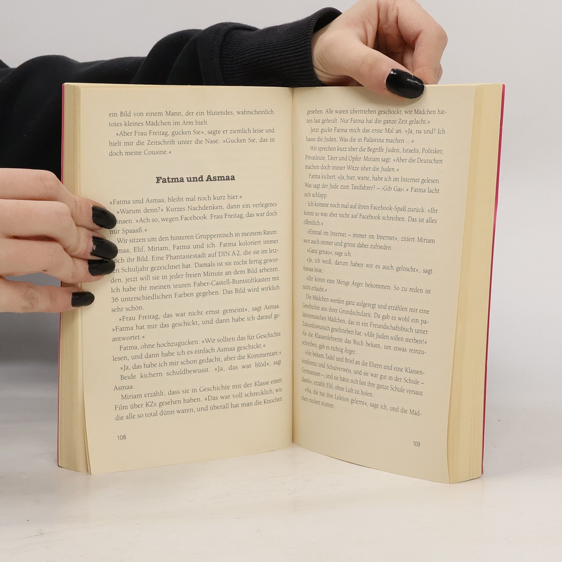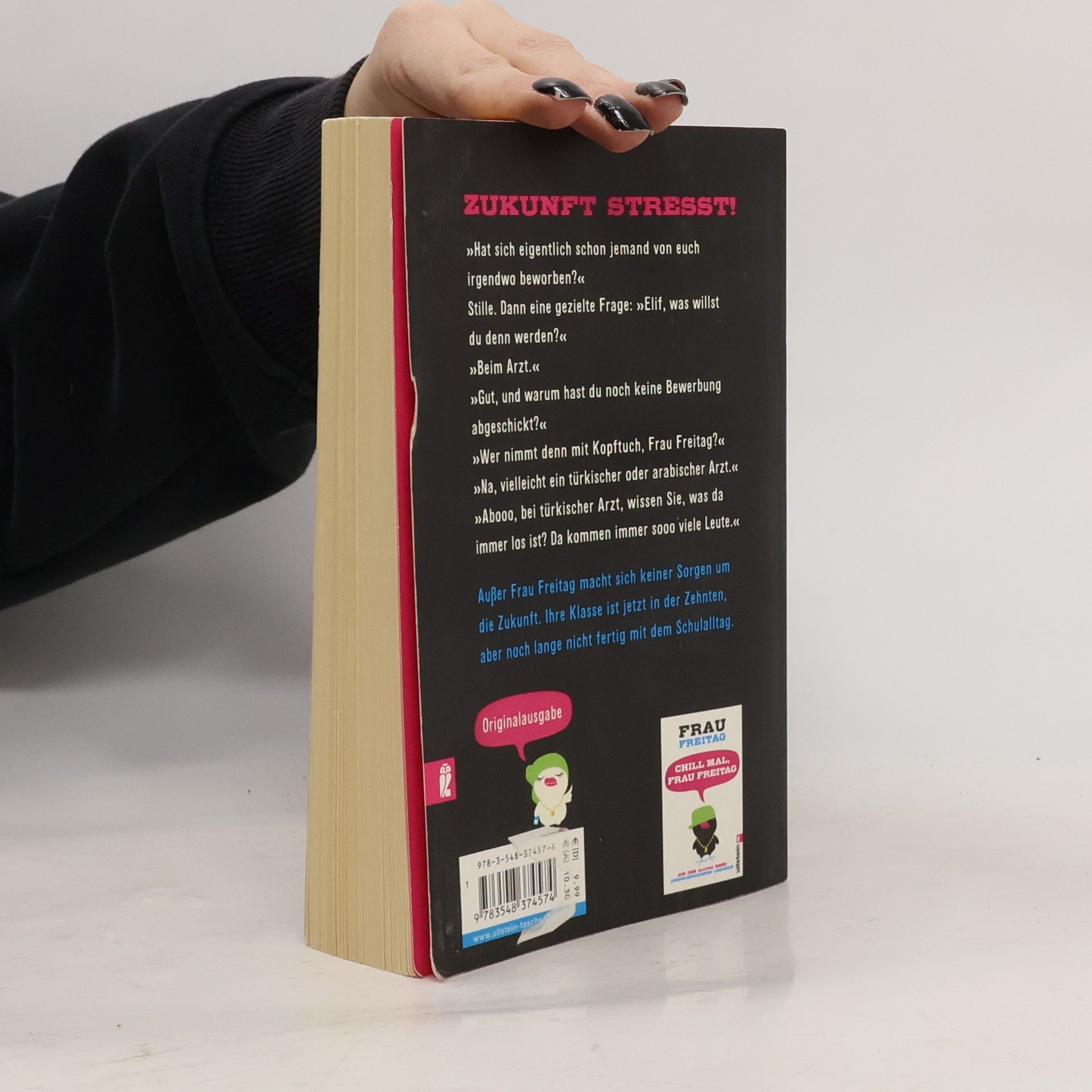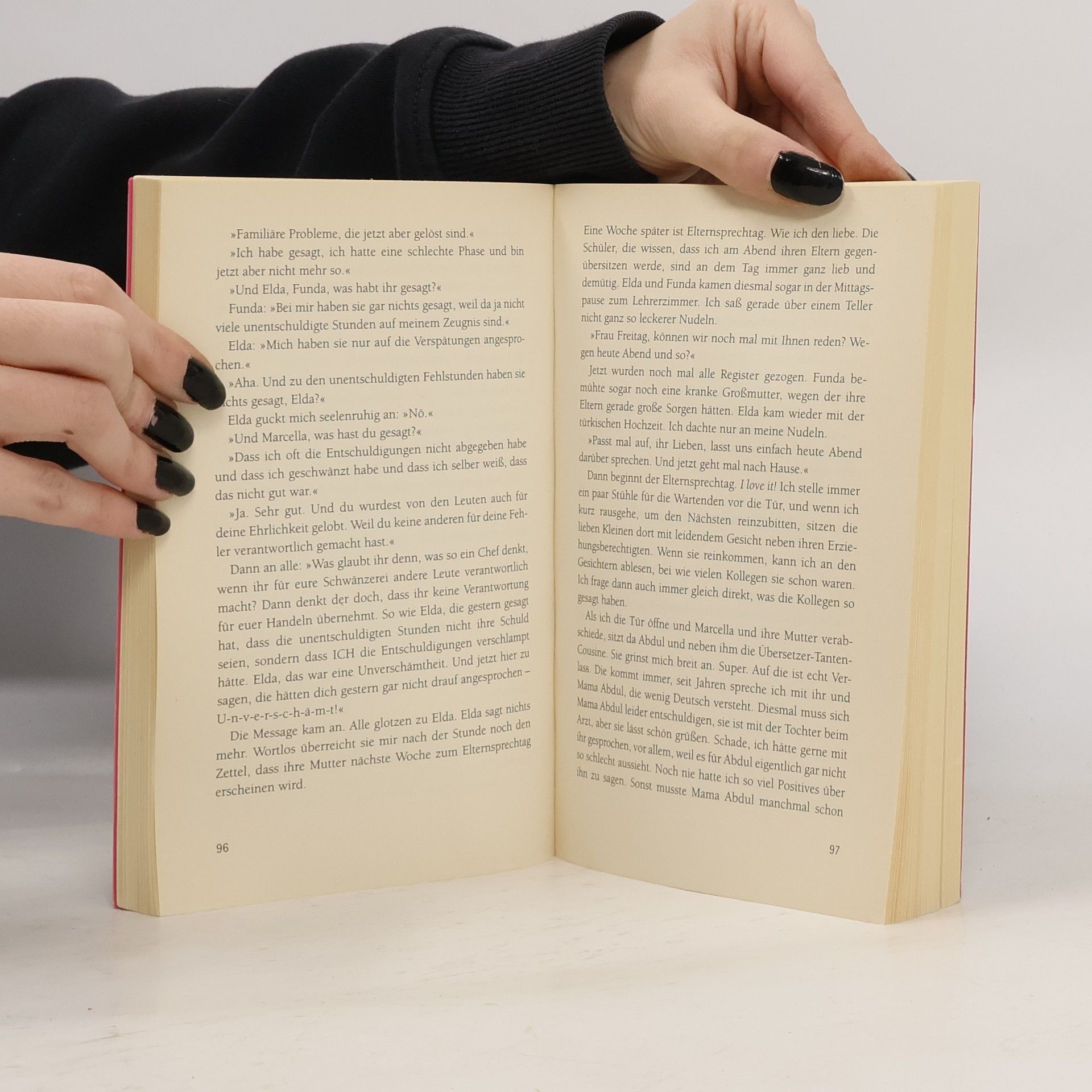 »Ich schwöre, ich habe perfekt deutsch gesprochen. Ich glaube, ich habe sogar gesagt: Ich habe mein Praktikum absolviert. So spreche ich sonst nie. «Frau Freitags Klasse ist jetzt in der Zehnten. Alles dreht sich um den Abschluss. Wirklich alles? Während Frau Freitag ihre Schüler nachts auf Facebook an ihre Bewerbungen erinnert und tagsüber durch die Prüfungen schleust, haben Bilal, Emre und Mariam ganz andere Probleme: »Wie kam man eigentlich ins Internet, als es noch keine Computer gab?« – »Moment noch Frau Freitag, gleich fertig mit Handy.« – »Hab ich Selbstbräuner raufgesprüht und heute Morgen voll Schock: volldunkelbraun.« Aber wie soll eigentlich Frau Freitag ohne ihre Klasse überleben?