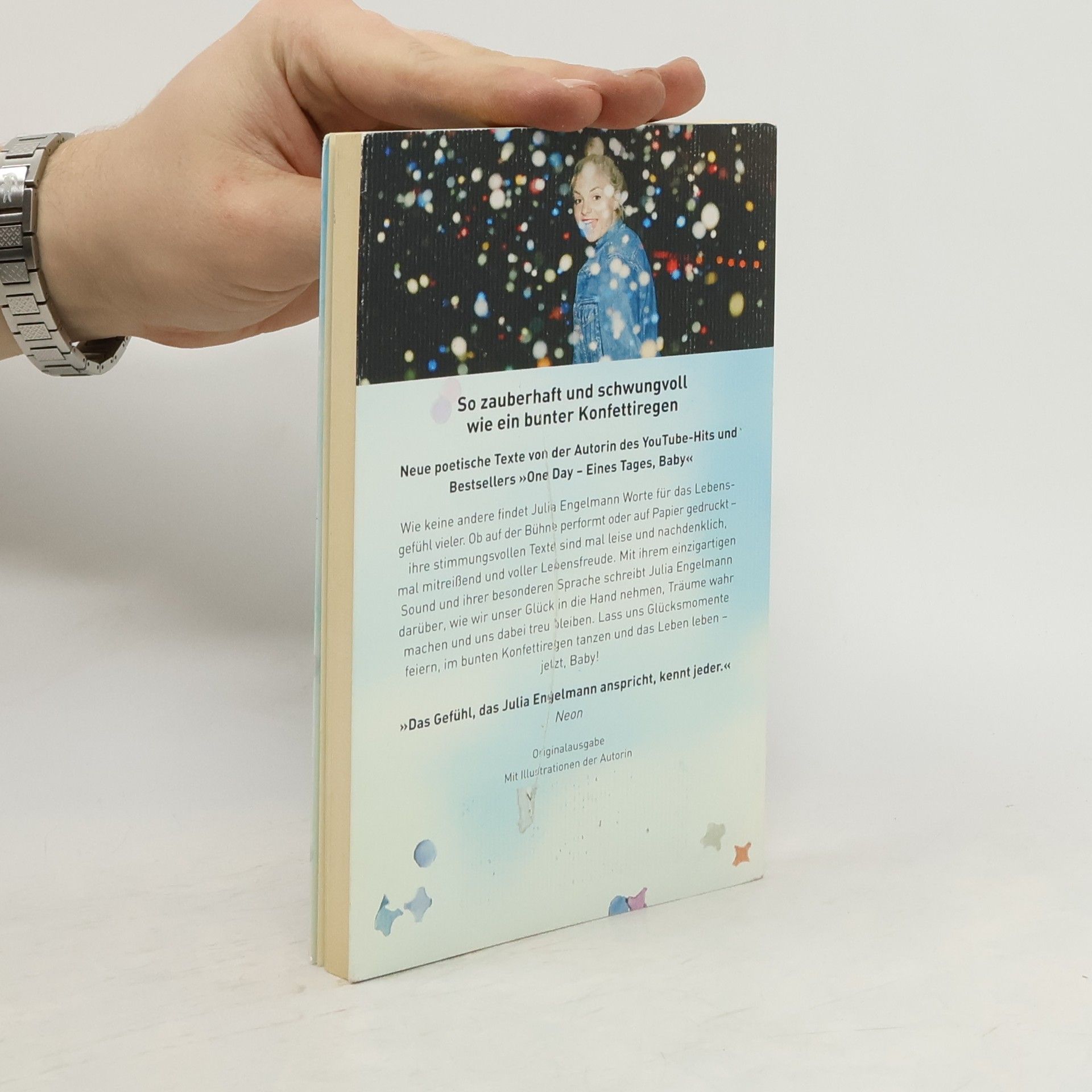 Seit ihr Slam „One Day“ ein sensationeller Interneterfolg wurde, fängt Julia Engelmann wie keine andere das Lebensgefühl einer ganzen Generation ein. Ob auf der Bühne performt oder auf Papier gedruckt – ihre Texte sind mitreißend, ehrlich und berührend. So auch in ihrem neuen Buch: Mit ihrem einzigartigen Sound und ihrer besonderen Sprache schreibt sie darüber, wie wir unser Glück in die Hand nehmen, Träume wahr machen und uns dabei treu bleiben. Lass uns Glücksmomente feiern, im bunten Konfettiregen tanzen und das Leben leben – jetzt, Baby! Ausstattung: mit farbigen Illustrationen