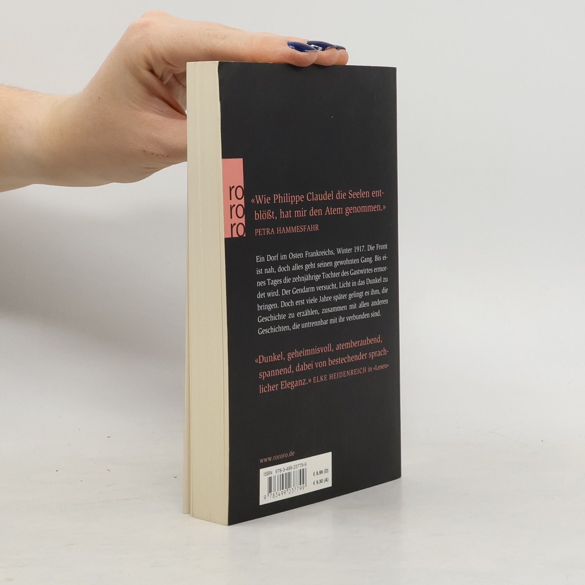 „Wie Philippe Claudel die Seelen entblößt, hat mir den Atem genommen.“ (Petra Hammesfahr) Ein Dorf im Osten Frankreichs, Winter 1917. Die Front ist nah, doch alles geht seinen gewohnten Gang. Bis eines Tages die zehnjährige Tochter des Gastwirtes ermordet wird. Der Gendarm versucht, Licht in das Dunkel zu bringen. Doch erst viele Jahre später gelingt es ihm, die Geschichte zu erzählen, zusammen mit allen anderen Geschichten, die untrennbar mit ihr verbunden sind. „Dunkel, geheimnisvoll, atemberaubend, spannend, dabei von bestechender sprachlicher Eleganz.“ (Elke Heidenreich in „Lesen“)