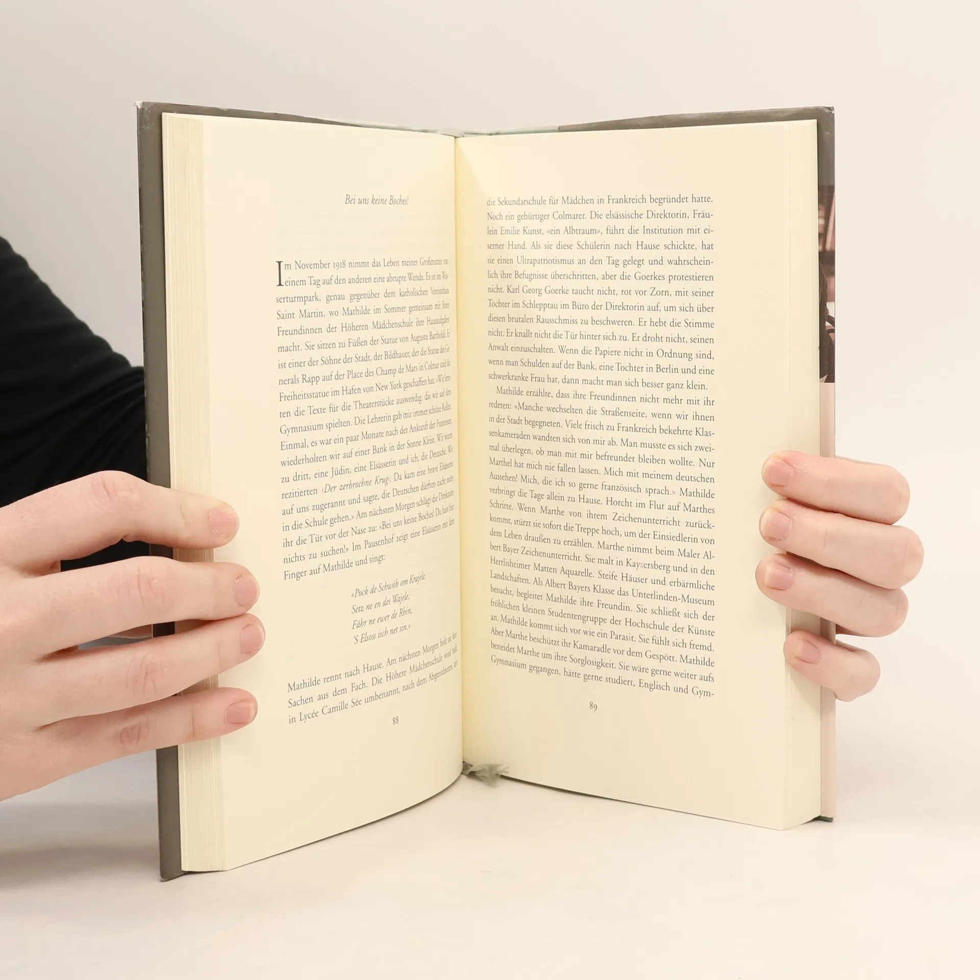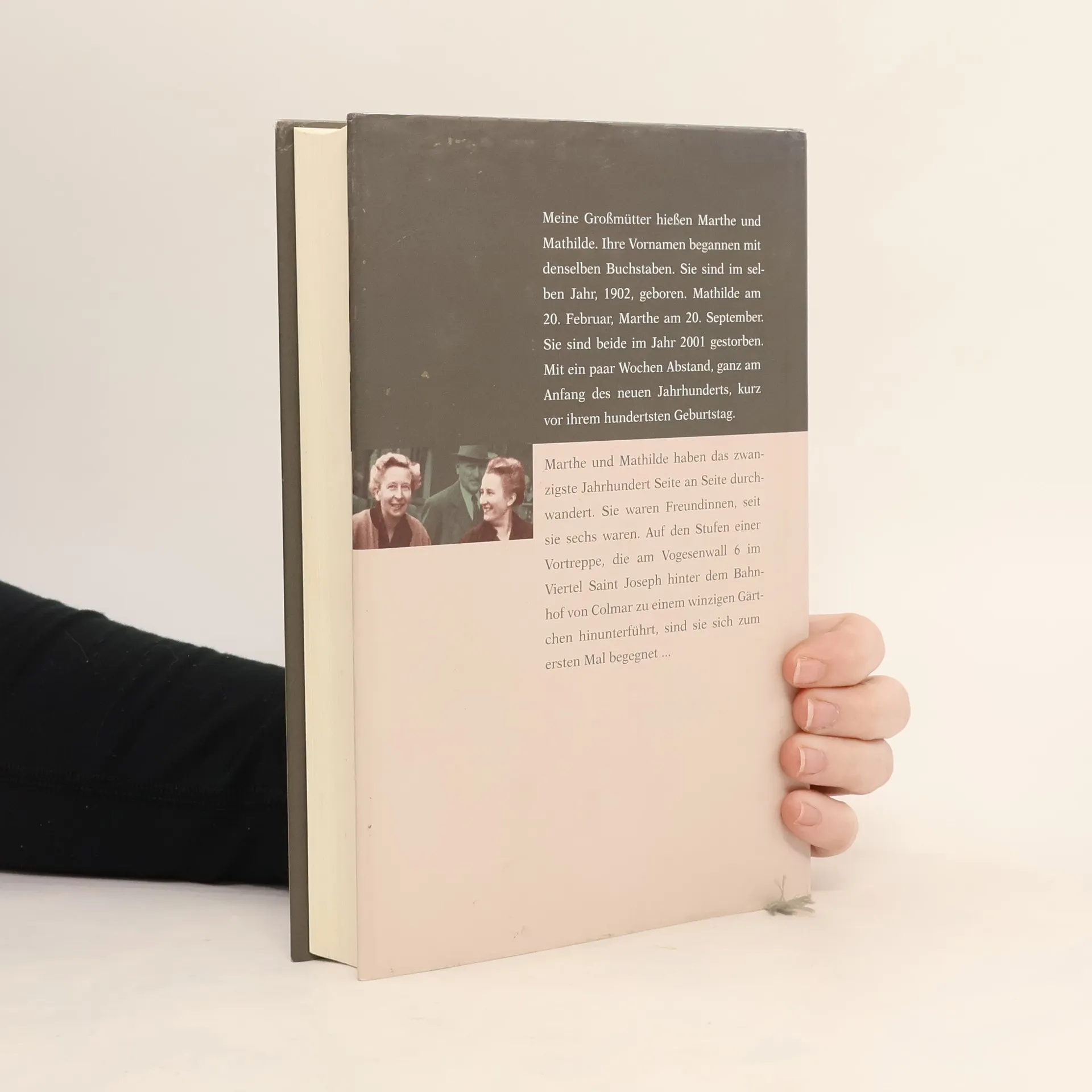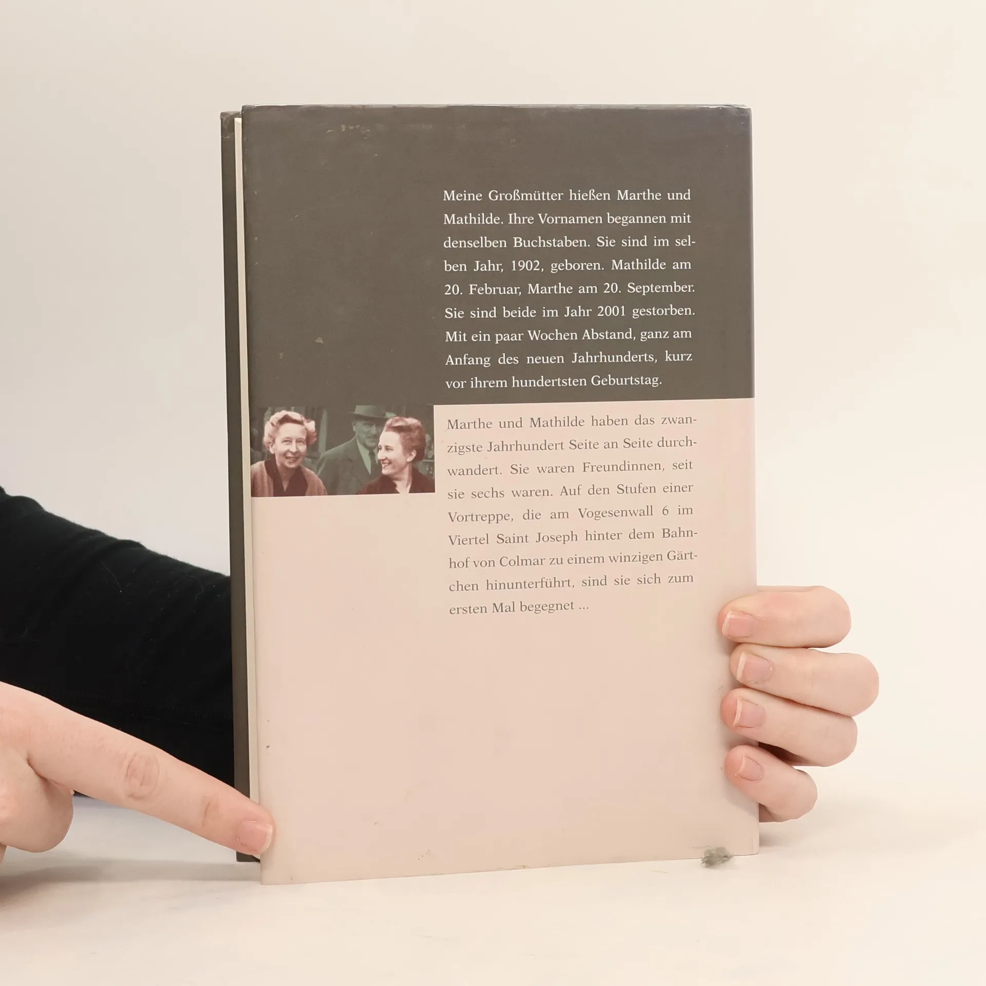 Meine Großmütter hießen Marthe und Mathilde. Ihre Vornamen begannen mit derselben Silbe. Sie sind im selben Jahr, 1902, geboren. Mathilde am 20. Februar, Marthe am 20. September. Sie sind beide im Jahr 2001 gestorben. Mit ein paar Wochen Abstand, ganz am Anfang des neuen Jahrhunderts, kurz vor ihrem hundertsten Geburtstag. Marthe und Mathilde haben das zwanzigste Jahrhundert Seite an Seite durchwandert. Sie waren Freundinnen, seit sie sechs waren. Auf den Stufen einer Vortreppe, die am Vogesenwall 6 im Viertel Saint Joseph hinter dem Bahnhof von Colmar zu einem winzigen Gärtchen hinunterführt, sind sie sich zum ersten Mal begegnet ...