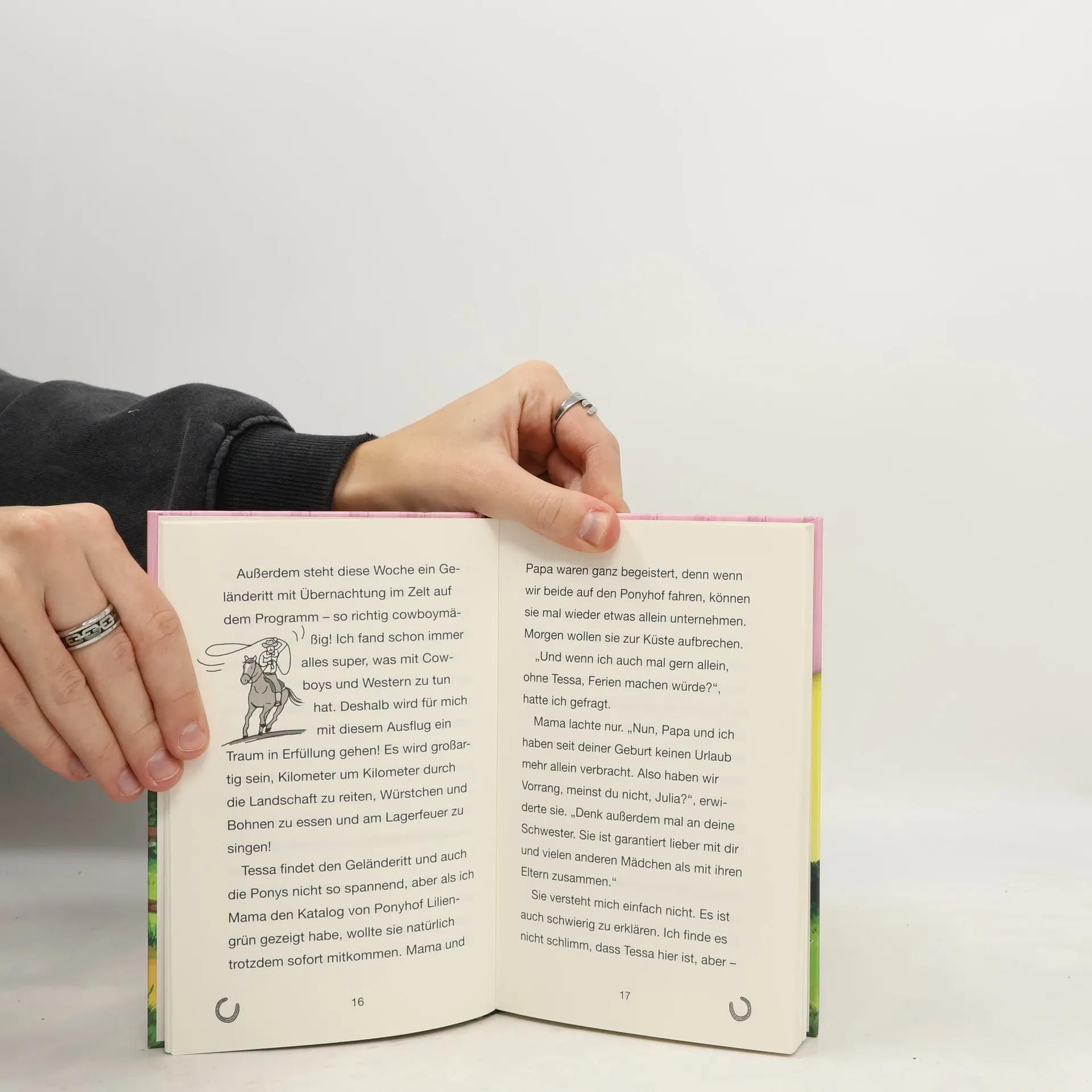 Welches Mädchen wünscht sich nicht ein eigenes Pony? Eigentlich jedes! Auf dem Ponyhof Liliengrün wird dieser Wunsch erfüllt! Eine Woche lang können die Freundinnen nach Herzenslust reiten, striegeln, Stall ausmisten - und natürlich ihr Lieblingspony streicheln! Julia kommt mit ihrer kleinen Schwester auf den Ponyhof. Sie freut sich riesig auf den Geländeritt, aber Tessa hängt ständig wie eine Klette an ihr und verdirbt ihr den Spaß. Doch dann verschwindet das kleine Mädchen und Julia macht sich große Sorgen …