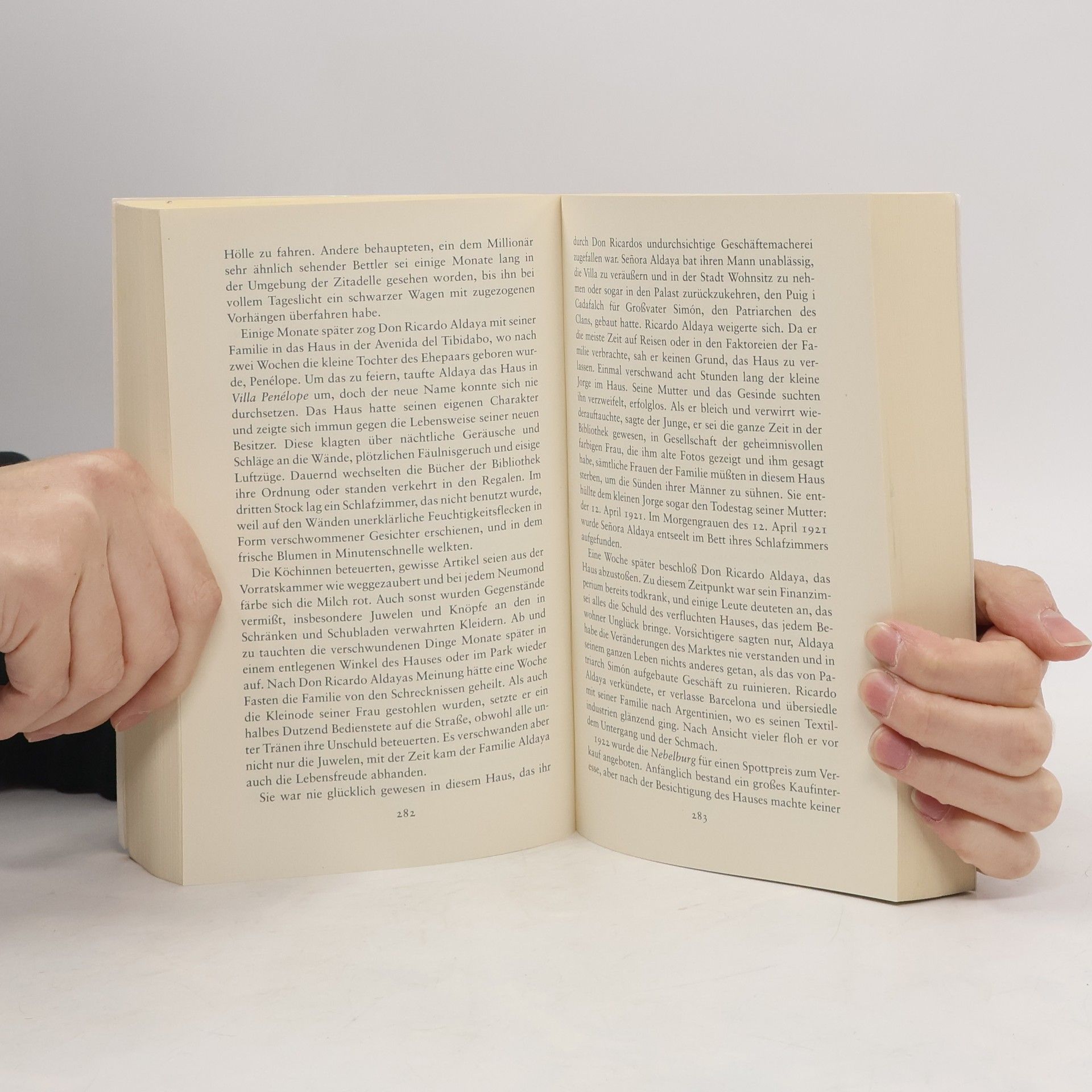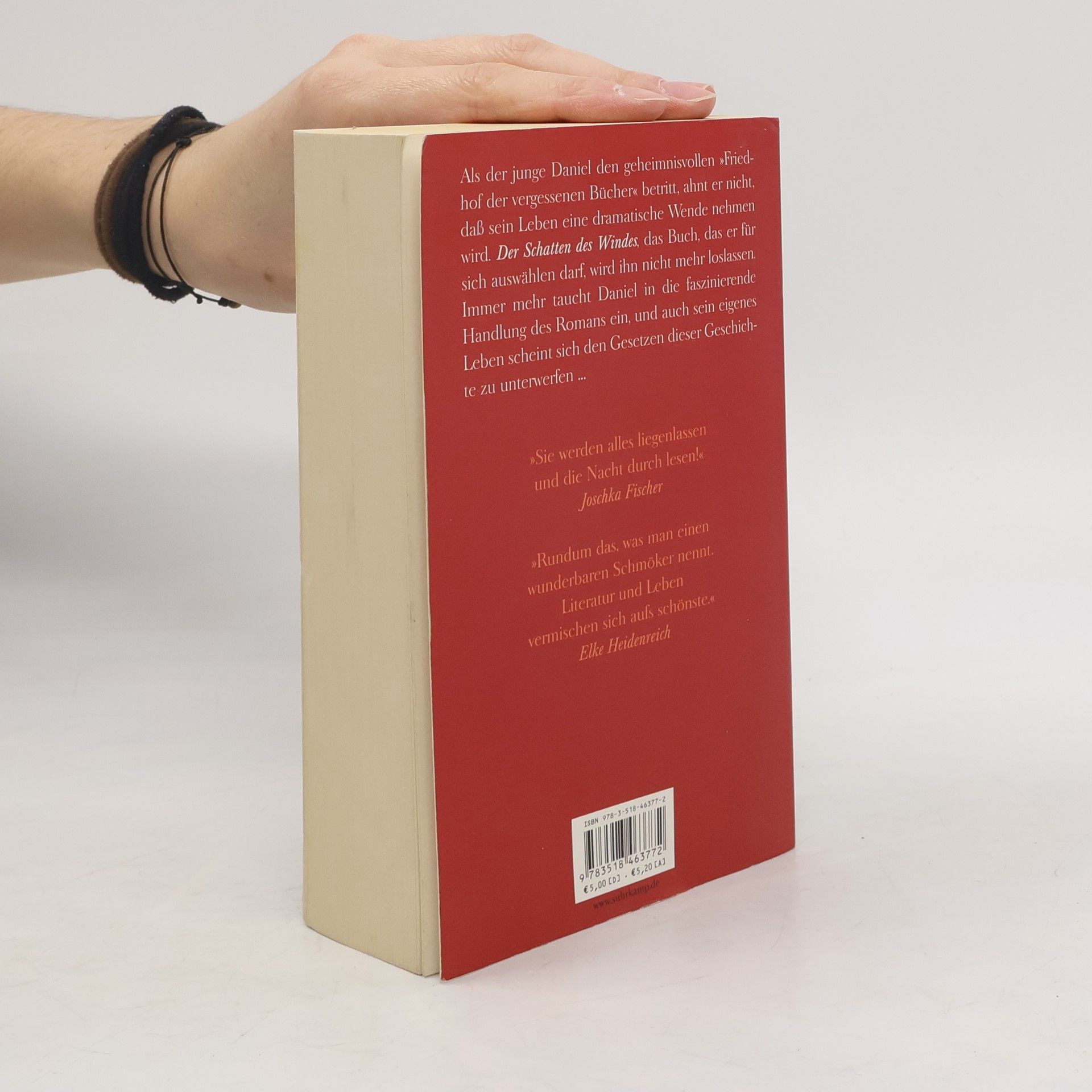 Als der junge Daniel mit seinem Vater den geheimen „Friedhof der Vergessenen Bücher“ betritt, ahnt er nicht, dass sein Leben eine drastische Wende nehmen wird. Er darf sich ein Buch auswählen, für das er allein verantwortlich ist. Das Buch, das er greift, wird ihn für immer begleiten. Aufgewachsen im grauen Barcelona der Franco-Ära, ist Daniel fasziniert von der Geschichte, die er liest. Er begibt sich auf die Suche nach dem geheimnisvollen Autor, Julián Carax, und will herausfinden, was ihm widerfahren ist und warum nur wenige Exemplare seiner Bücher existieren. Was als neugieriges Spiel beginnt, wird zur Bedrohung, als ein Mann mit narbiger Ledermaske auftaucht, der hinter Daniels Exemplar her ist. Die unheimliche Verfolgung wird konkret. Daniels Leben wird zunehmend von dem mysteriösen Autor bestimmt, dessen Bücher jemand systematisch zu vernichten sucht. Alle Menschen, die er trifft, auch die Frauen, in die er sich verliebt, scheinen Figuren in diesem großen Spiel zu sein, die ihn in die Irre führen. Die Grenzen zwischen Fiktion und Realität verschwimmen, und die Schatten furchtbarer Ereignisse drohen sein Leben zu verdunkeln. Vor dem gespenstisch schimmernden Hintergrund Barcelonas entfaltet sich ein dicht gewobener Spannungsroman, der mit Witz und souveräner Erzählkunst eine packende Geschichte erzählt.