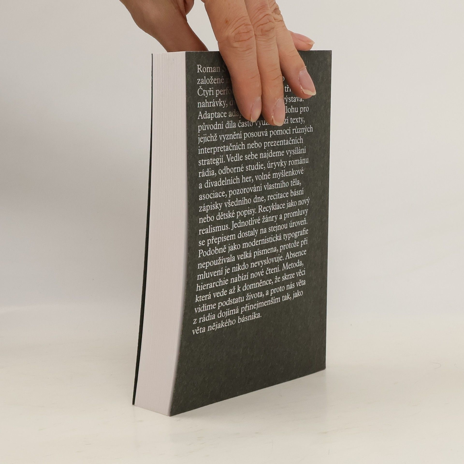 Roman Štětina převádí své práce založené na textu zpět do slov. Čtyři performance, tři videa, tři audio nahrávky, dva texty a jedna výstava. Adaptace adaptace. Jako předlohu pro původní díla často využívá cizí texty, jejichž vyznění posouvá pomocí různých interpretačních nebo prezentačních strategií. Vedle sebe najdeme vysílání rádia, odborné studie, úryvky románu a divadelních her, volné myšlenkové asociace, pozorování vlastního těla, zápisky všedního dne, recitace básní nebo dětské popisy. Recyklace jako nový realismus. Jednotlivé žánry a promluvy se přepisem dostaly na stejnou úroveň. Podobně jako modernistická typografie nepoužívala velká písmena, protože při mluvení je nikdo nevyslovuje. Absence hierarchie nabízí nové čtení. Metoda, která vede až k domněnce, že skrze věci vidíme podstatu života, a proto nás věta z rádia dojímá přinejmenším tak, jako věta nějakého básníka.