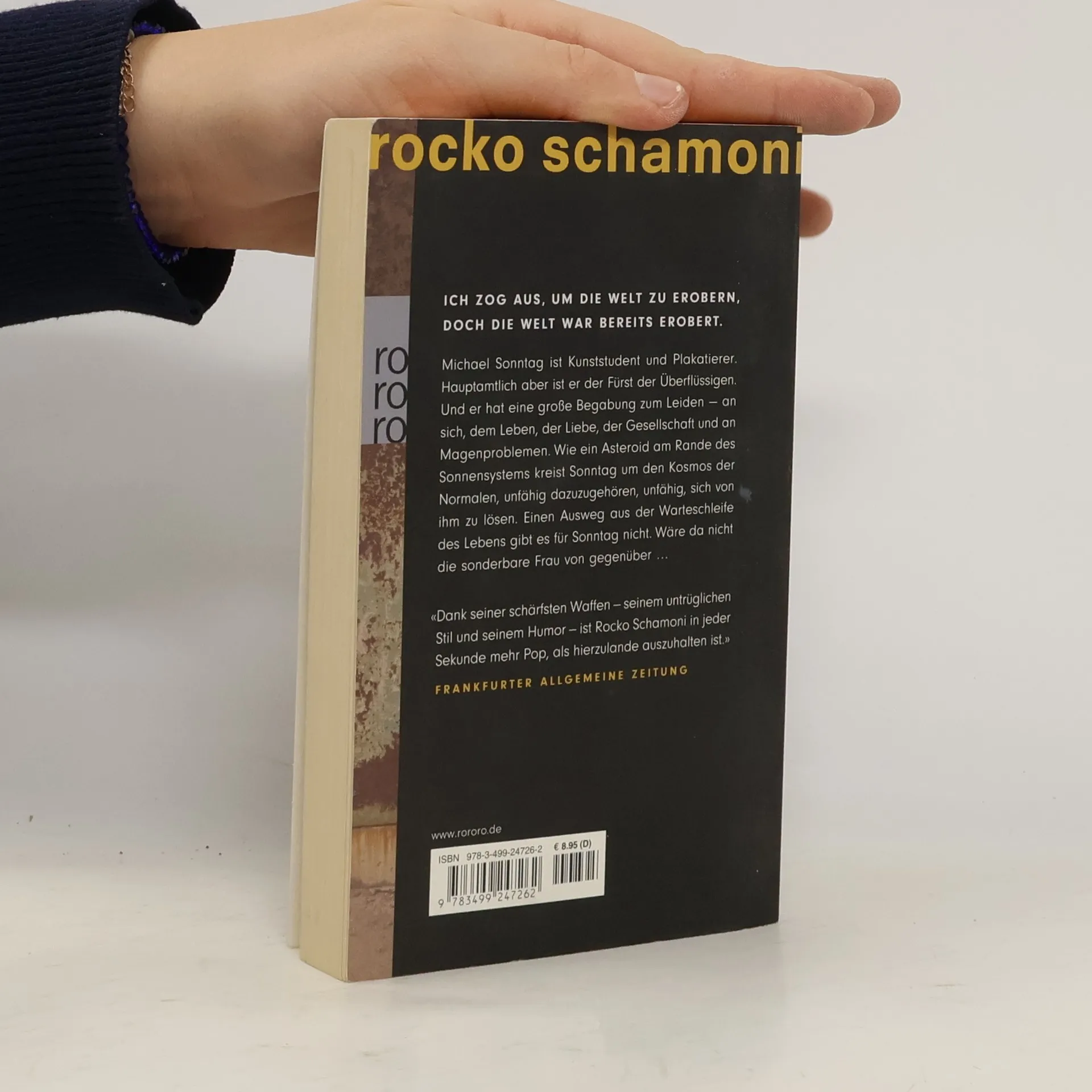 Ich zog aus, um die Welt zu erobern, doch die Welt war bereits erobert. Michael Sonntag ist Kunststudent und Plakatierer. Hauptamtlich aber ist er der Fürst der Überflüssigen. Und er hat eine große Begabung zum Leiden – an sich, dem Leben, der Liebe, der Gesellschaft und an Magenproblemen. Wie ein Asteroid am Rande des Sonnensystems kreist Sonntag um den Kosmos der Normalen, unfähig dazu zu gehören, unfähig sich von ihm zu lösen. Einen Ausweg aus der Warteschleife des Lebens gibt es für Sonntag nicht. Wäre da nicht die sonderbare Frau von Gegenüber... „Dank seiner schärfsten Waffen – seinem untrüglichen Stil und seinem Humor – ist Rocko Schamoni in jeder Sekunde mehr Pop, als hierzulande auszuhalten ist.“ (Frankfurter Allgemeine Zeitung)